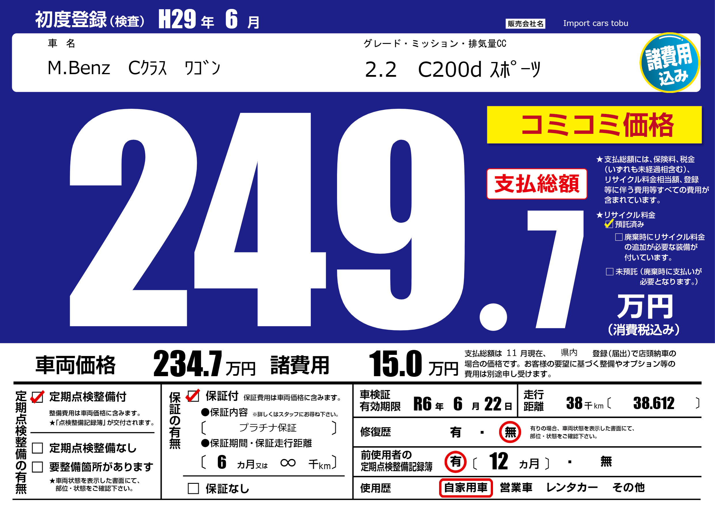 | 車名 | M.Benz Cクラス ワゴン | グレード ミッション 排気量 |