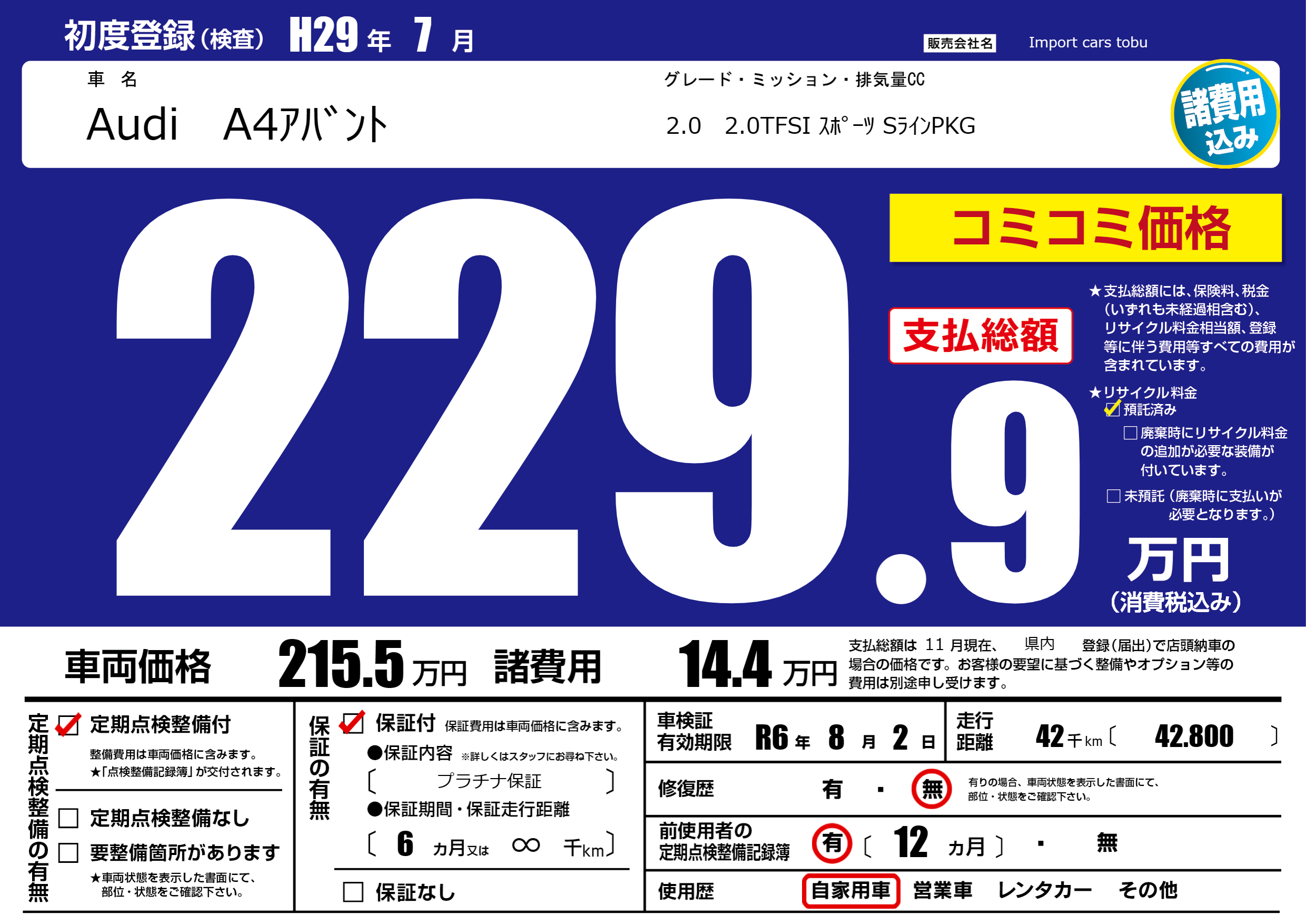 保証付き 保証内容( プラチナ保証) 6ヶ月または(∞)千kmまで |