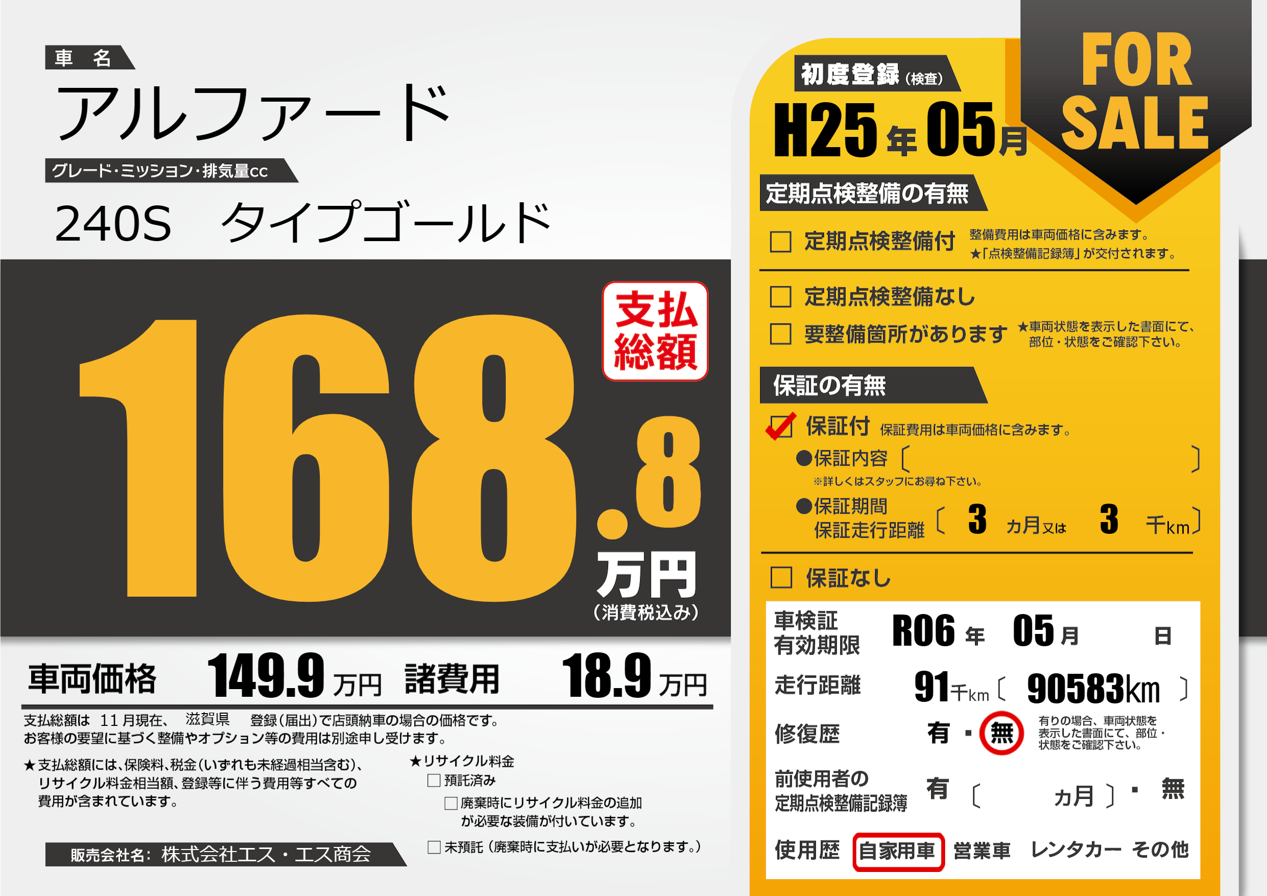| 車名 | アルファード | グレード ミッション 排気量 |