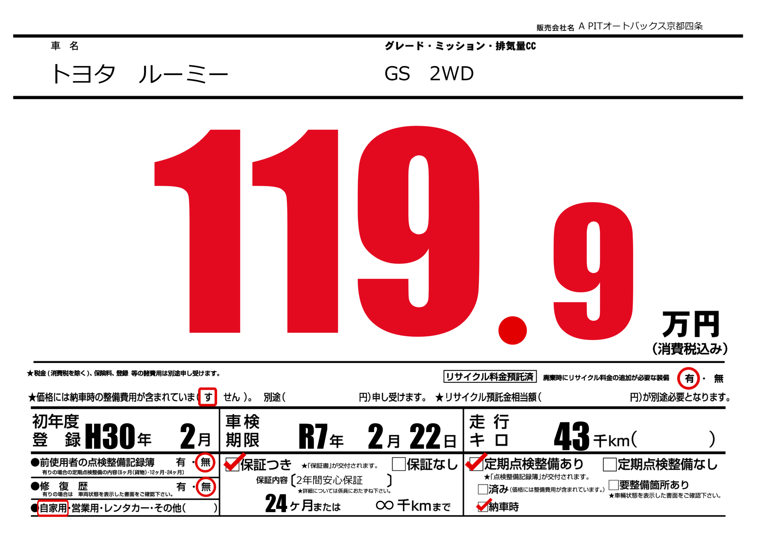 | 車名 | トヨタ ルーミー | グレード ミッション 排気量 |