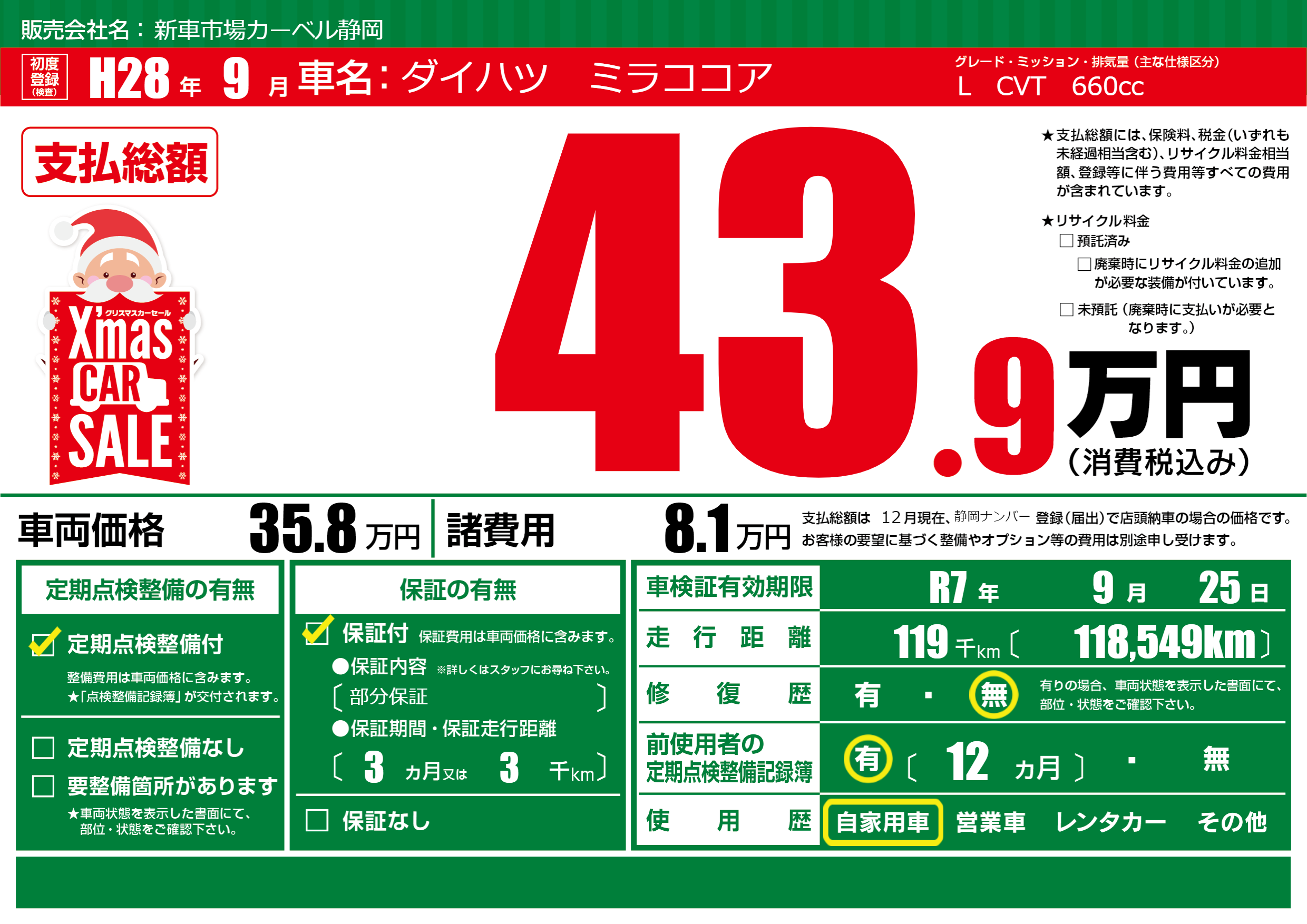 | 車名 | ダイハツ ミラココア | グレード ミッション 排気量 |