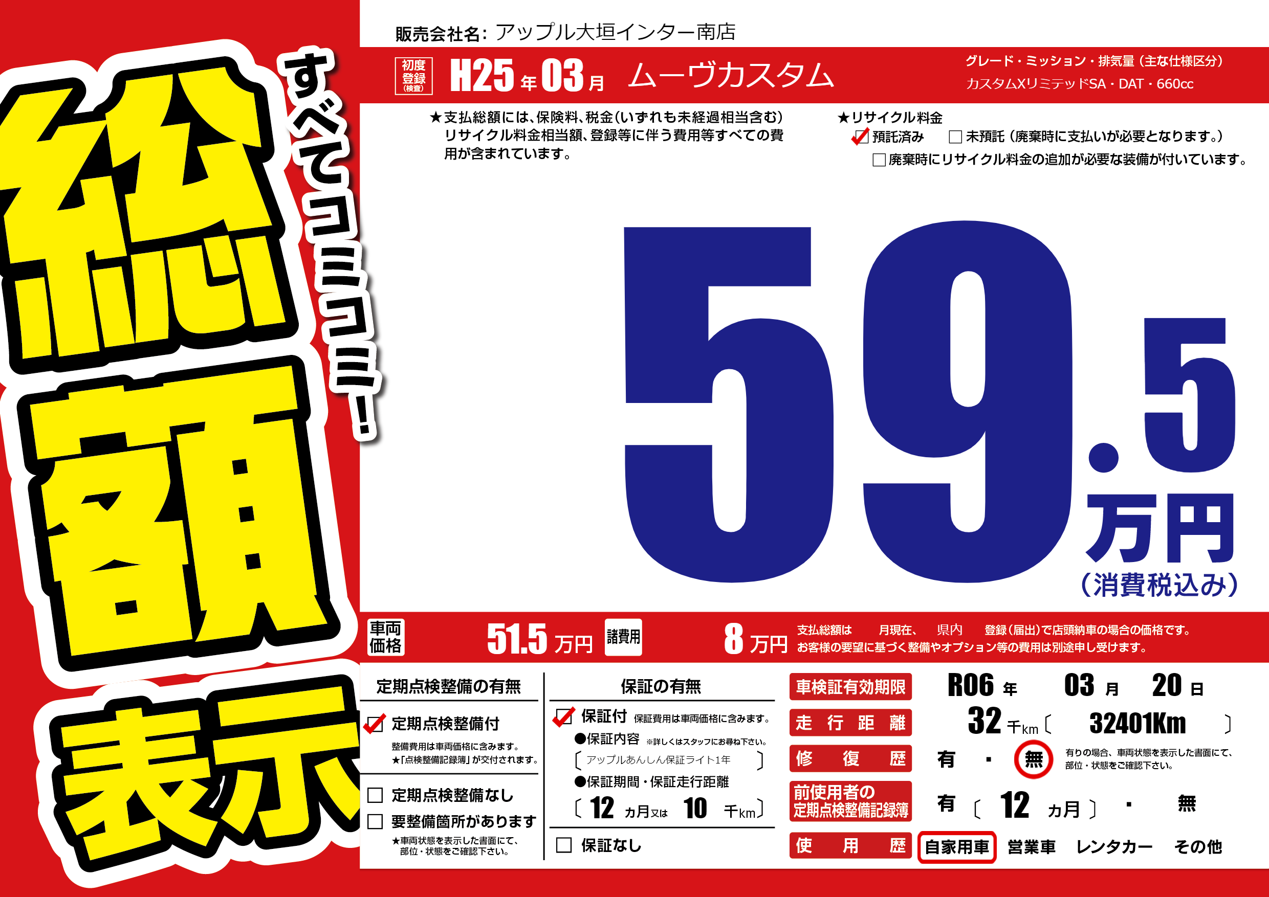 | 走行キロ | 3.2万km | 初年度登録 | H25年03月 |