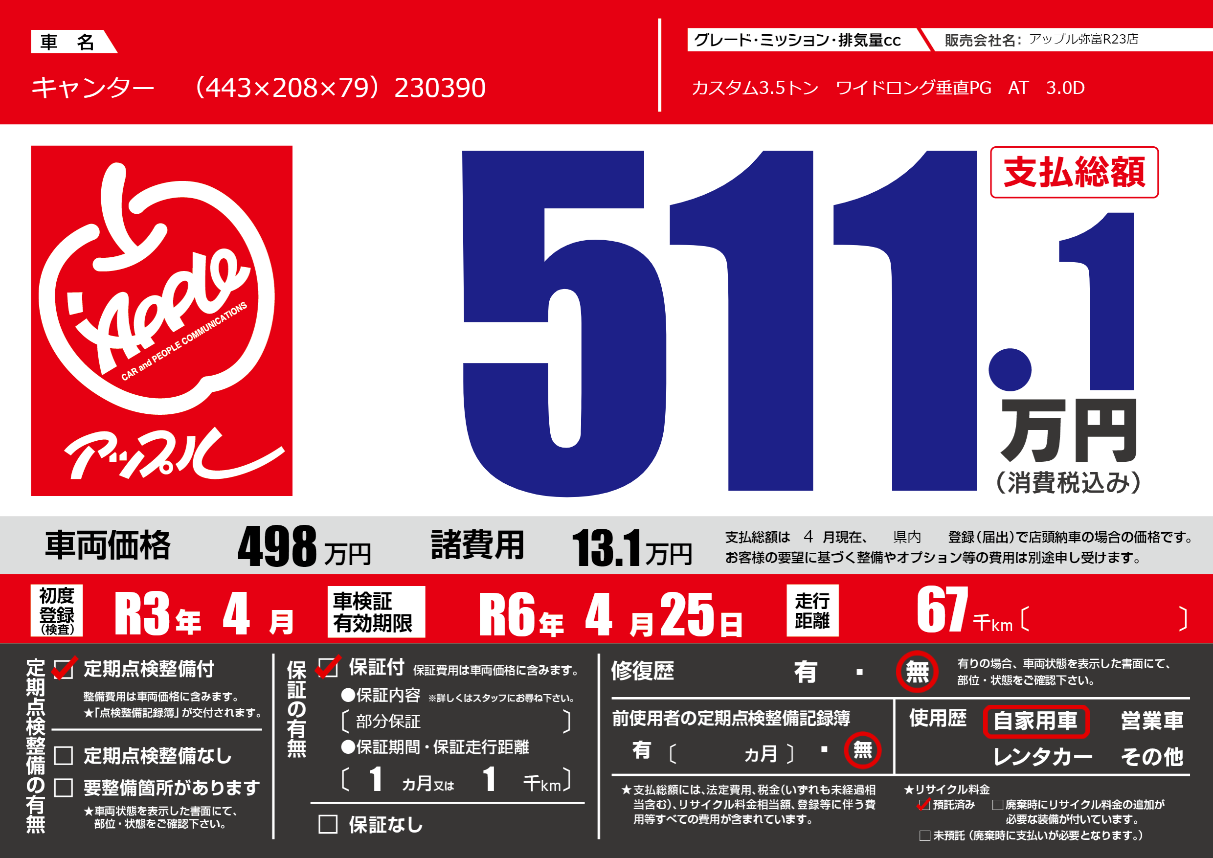| 車名 | キャンター (443×208×79)230390 | グレード ミッション 排気量 |