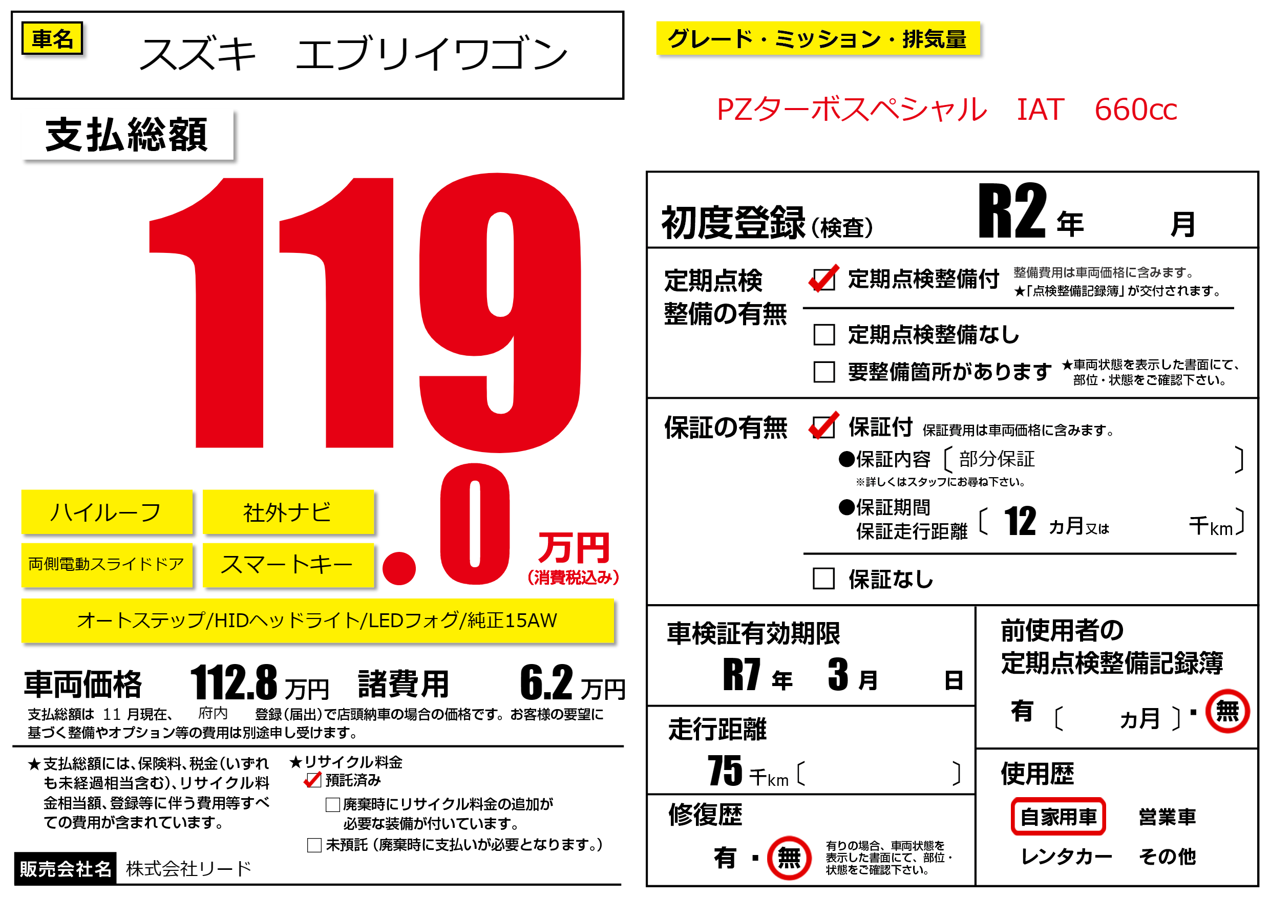 | 車名 | スズキ エブリイワゴン | グレード ミッション 排気量 |