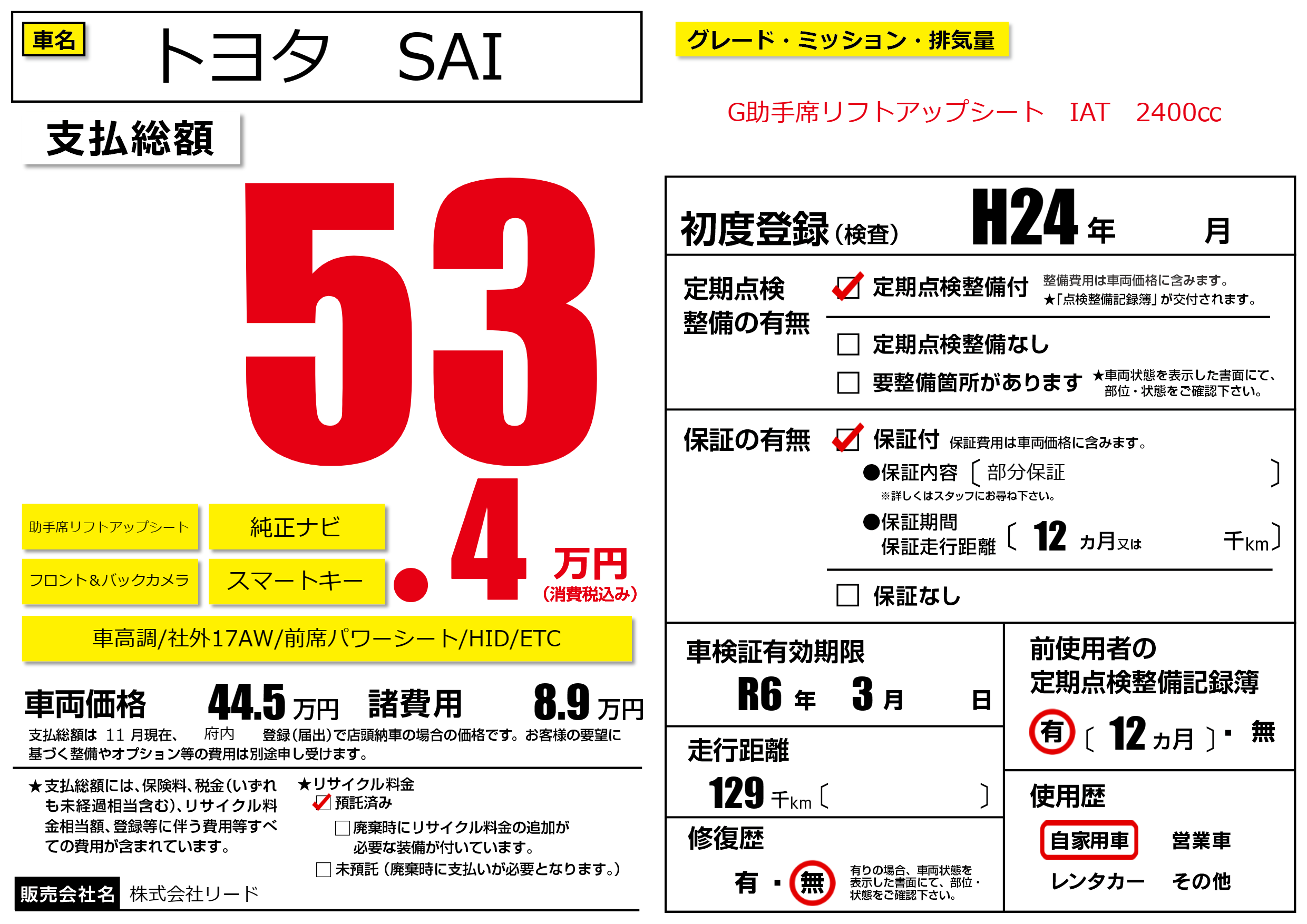 | 車名 | トヨタ SAI | グレード ミッション 排気量 |