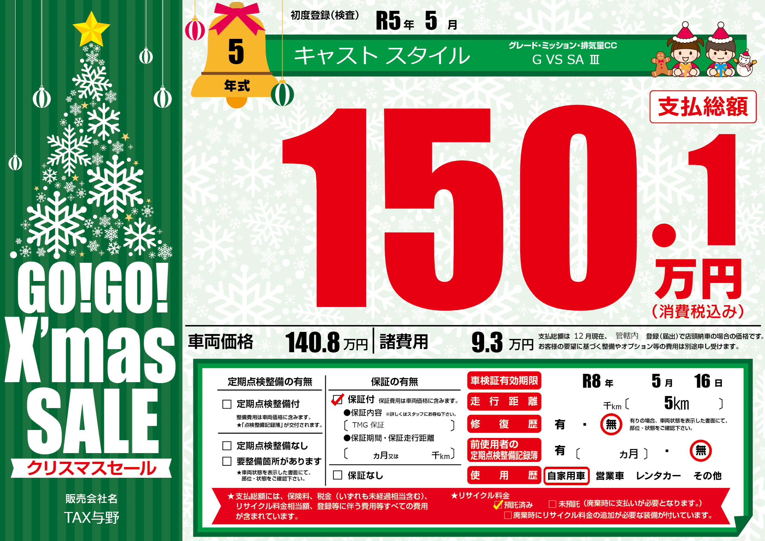保証付き 保証内容(TMG 保証) ---ヶ月または()千kmまで |