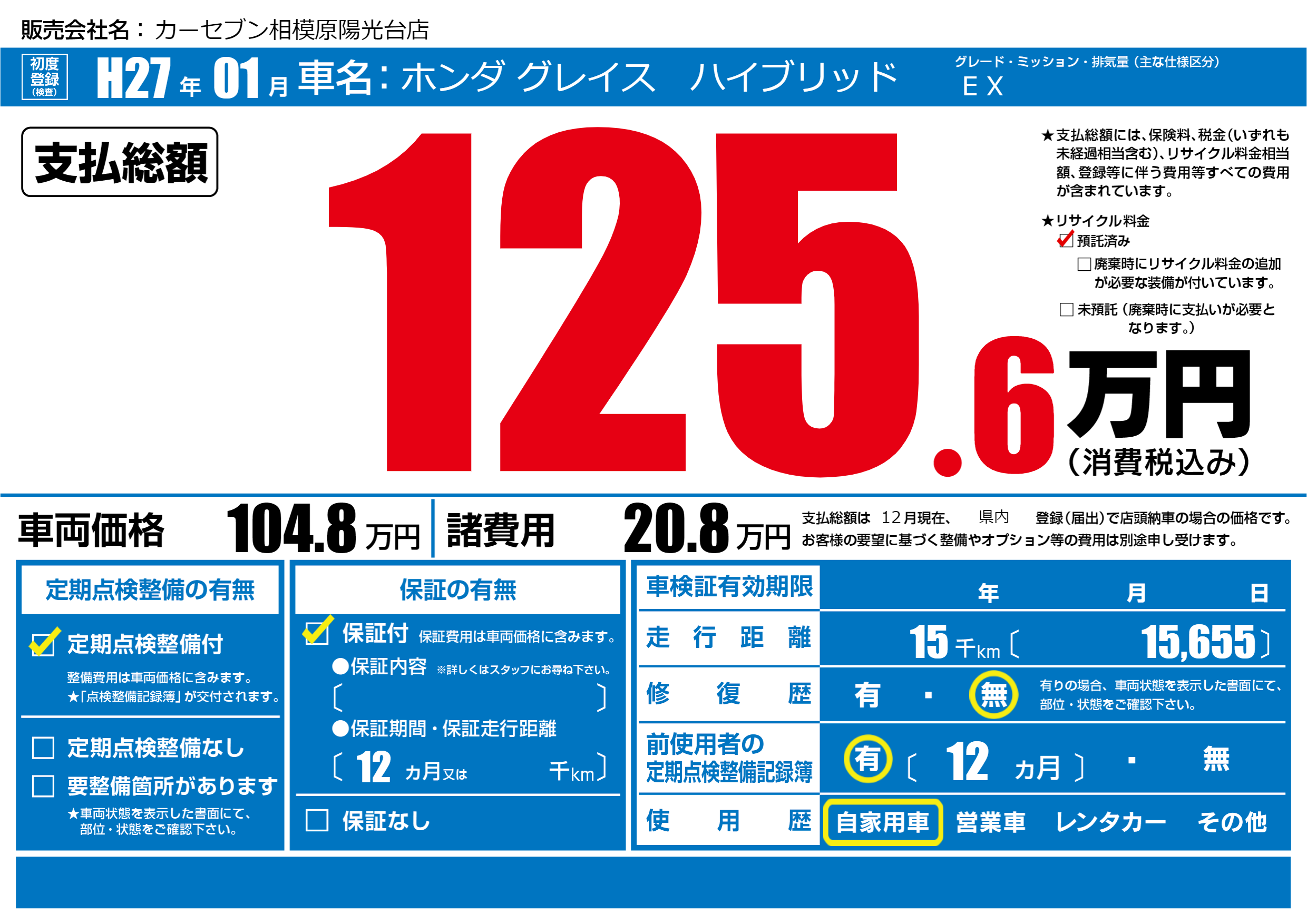 | 車名 | ホンダ グレイス ハイブリッド | グレード ミッション 排気量 |