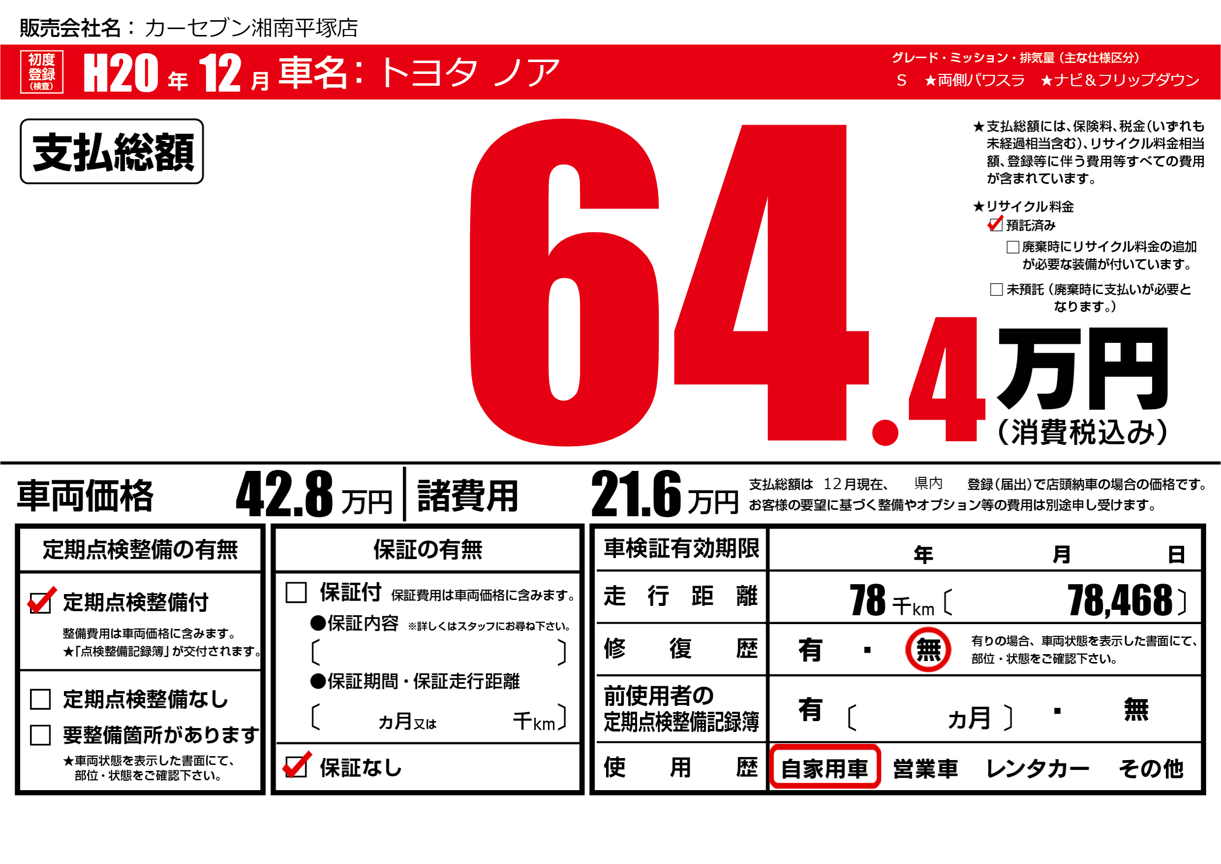 | 走行キロ | 7.8万km | 初年度登録 | H20年12月 |