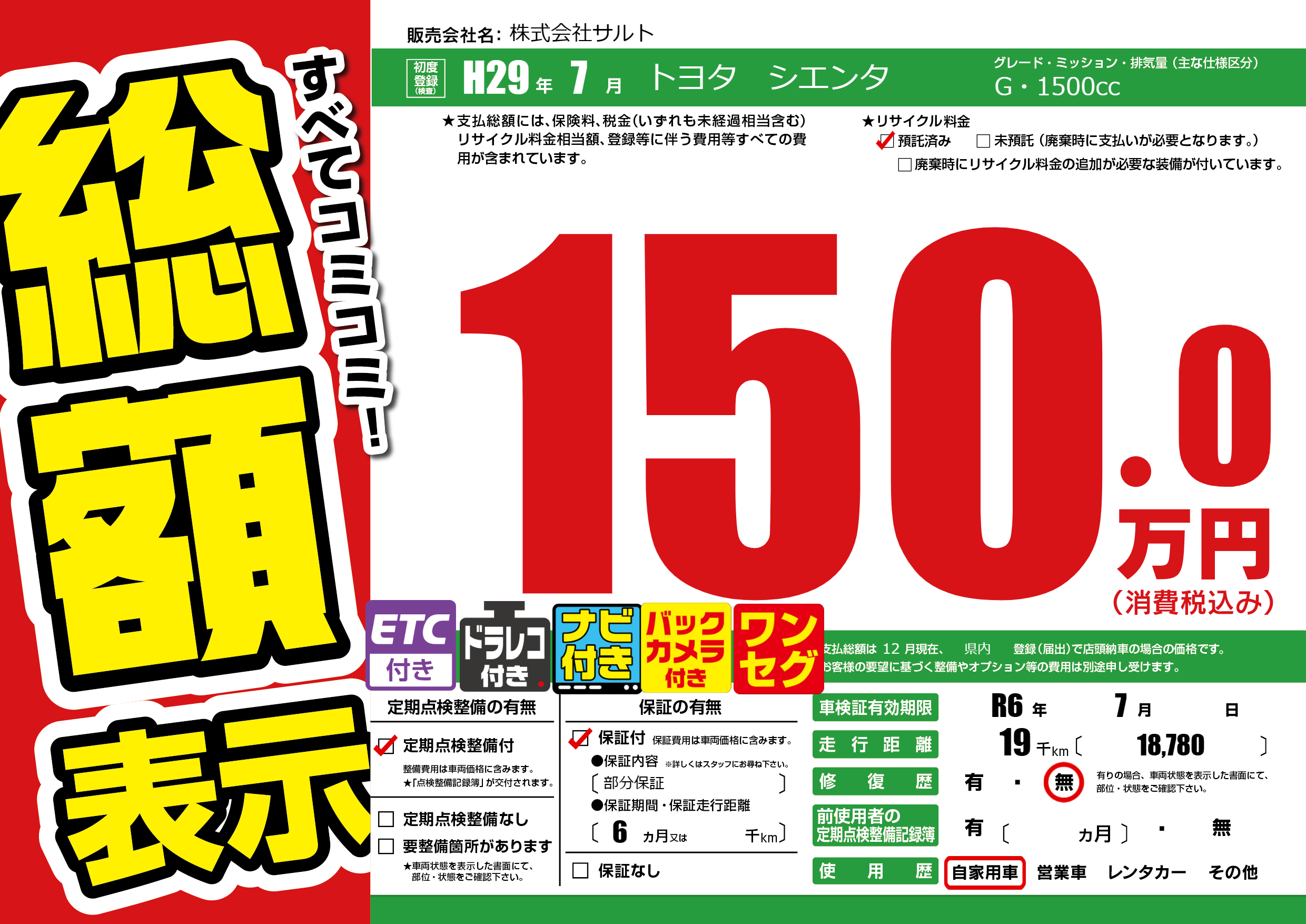 | 車名 | トヨタ シエンタ | グレード ミッション 排気量 |