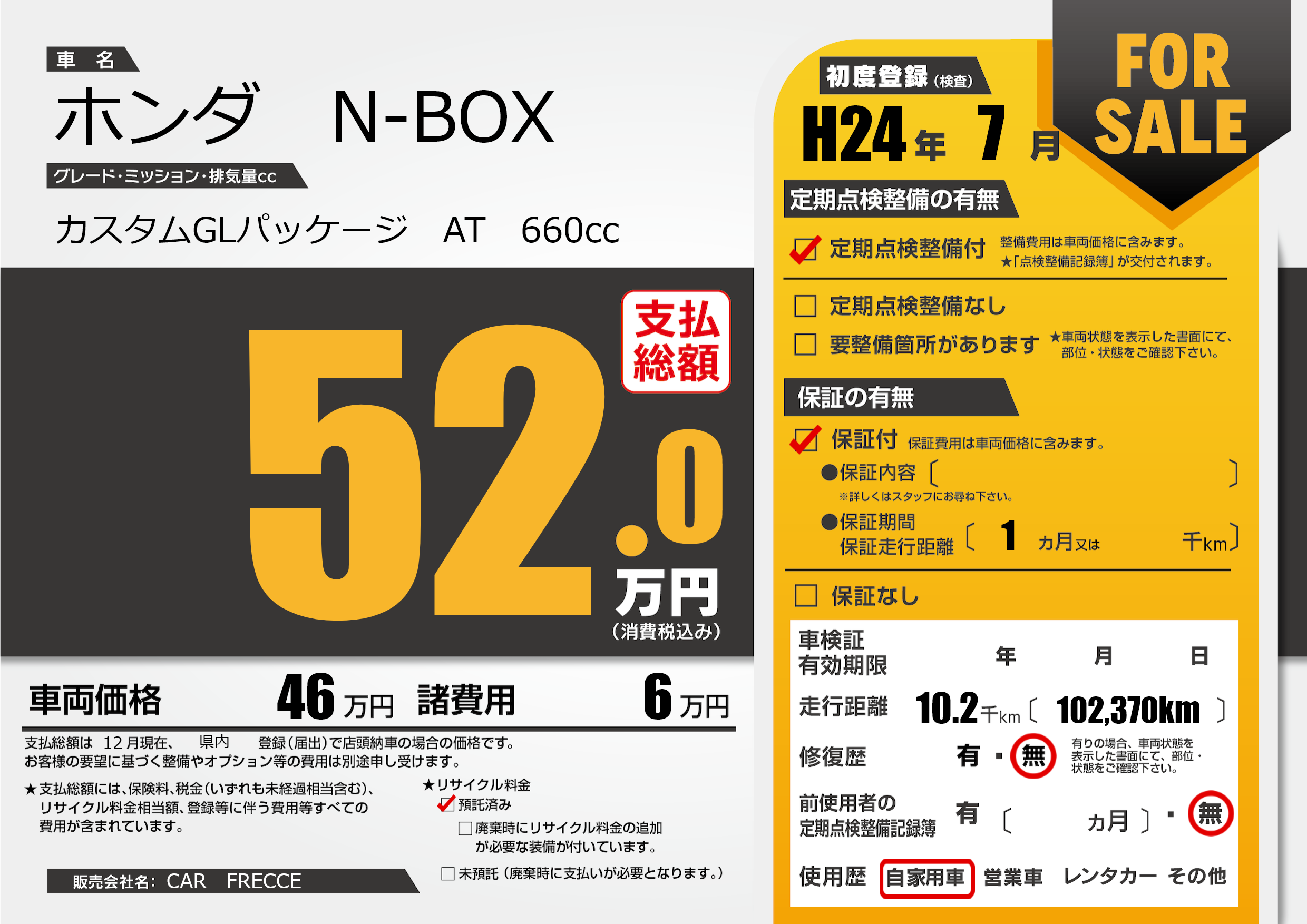 | 車名 | ホンダ N-BOX | グレード ミッション 排気量 |