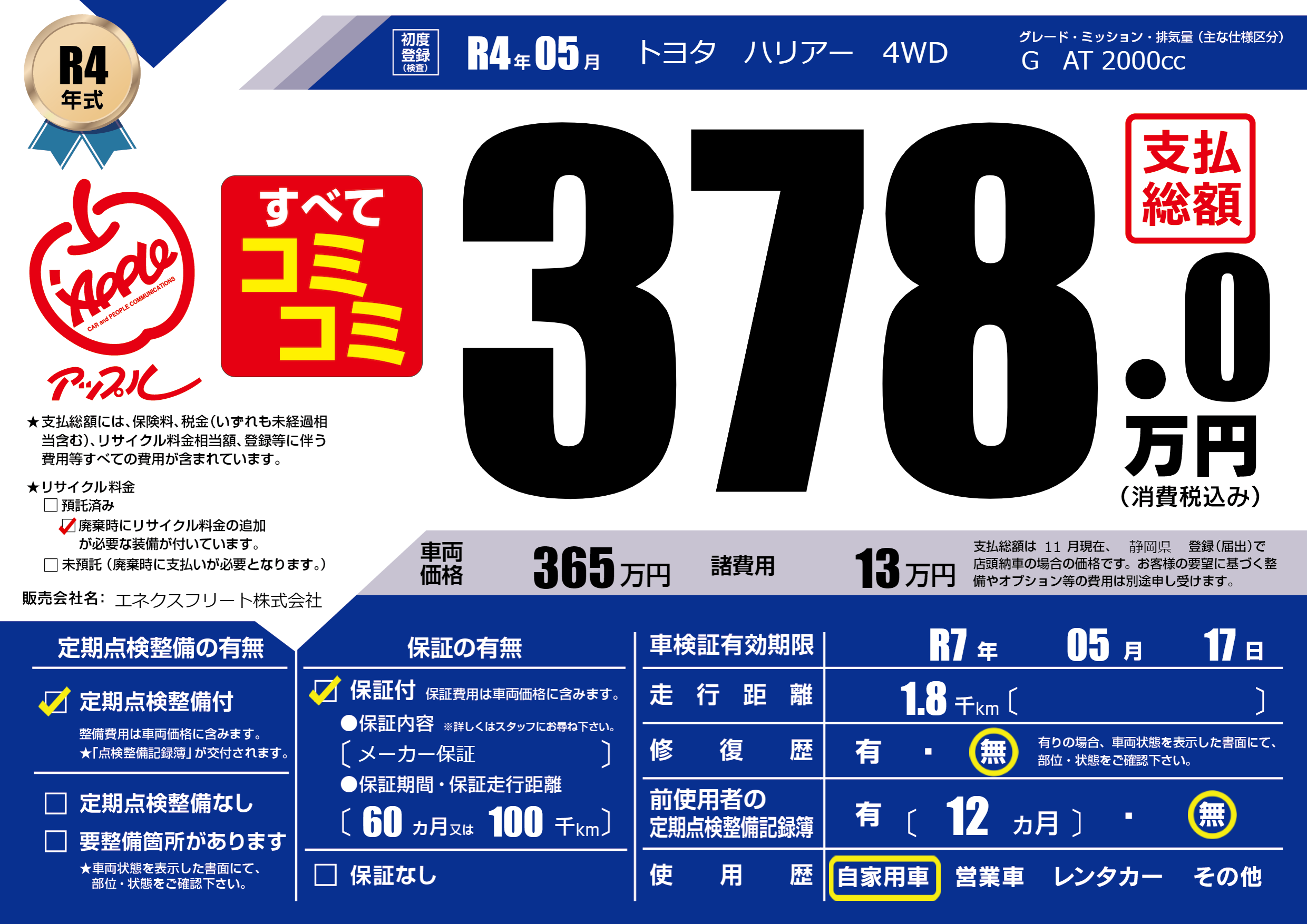 | 走行キロ | 0.1万km | 初年度登録 | R4年05月 |