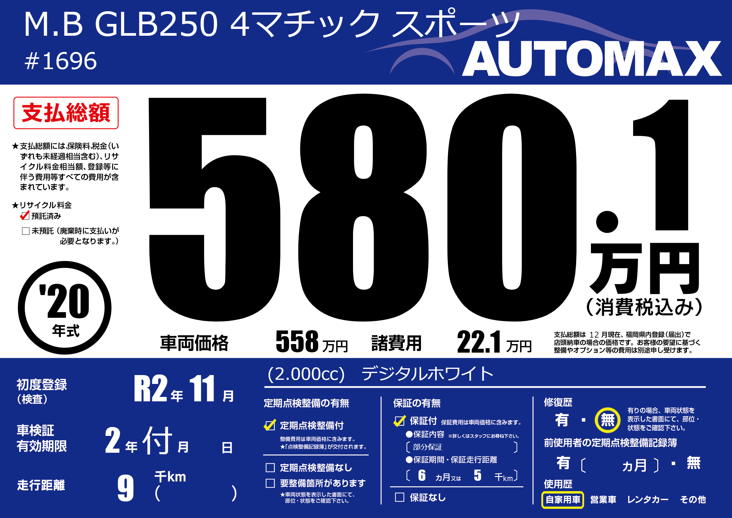 | 車名 | M.B GLB250 4マチック スポーツ | グレード ミッション 排気量 |
