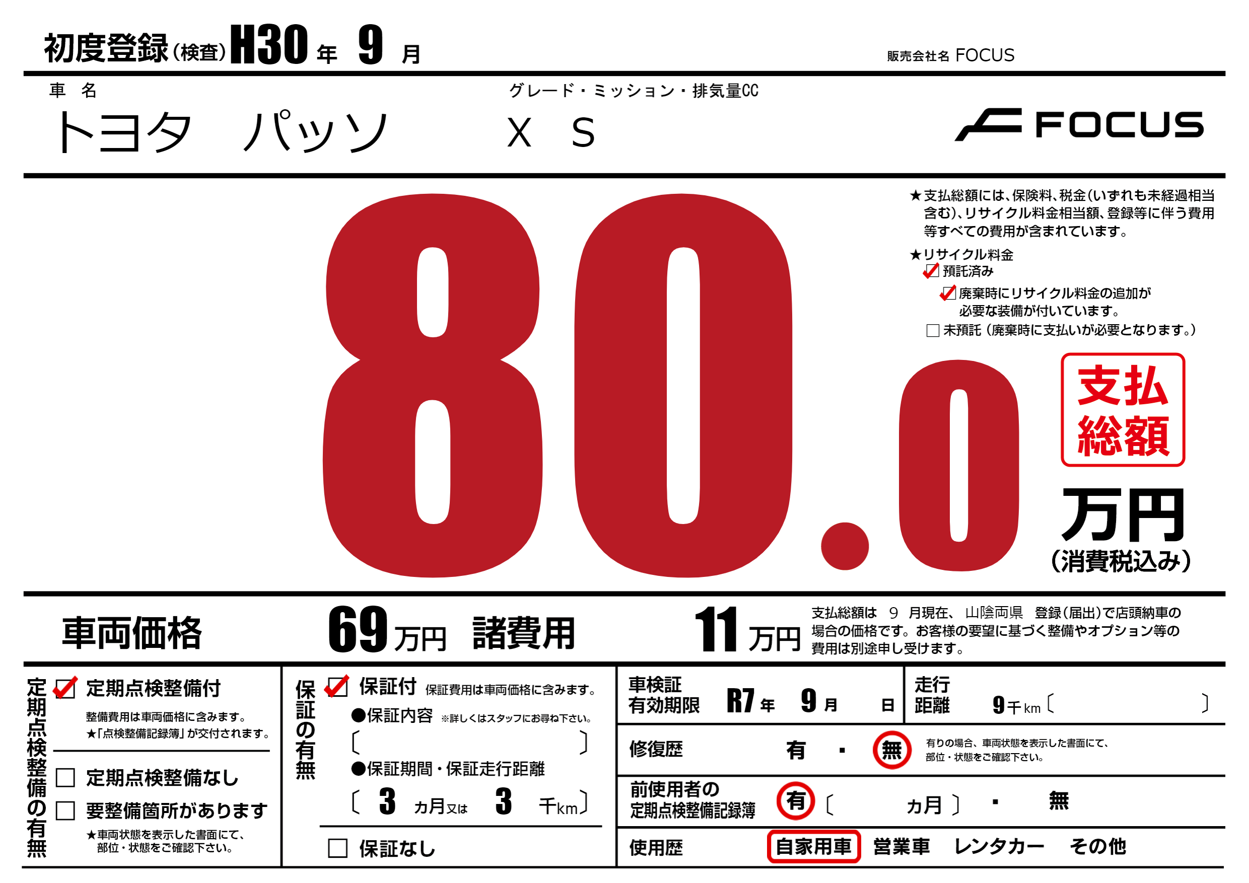 | 車名 | トヨタ パッソ | グレード ミッション 排気量 |