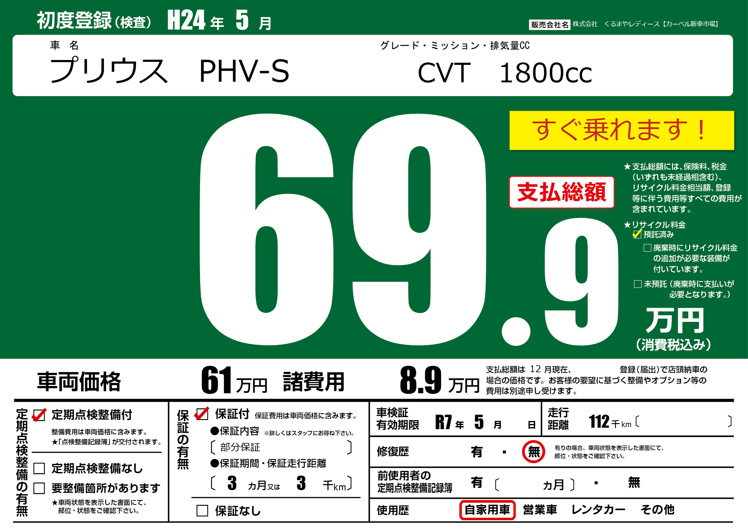 | 走行キロ | 11.2万km | 初年度登録 | H24年5月 |