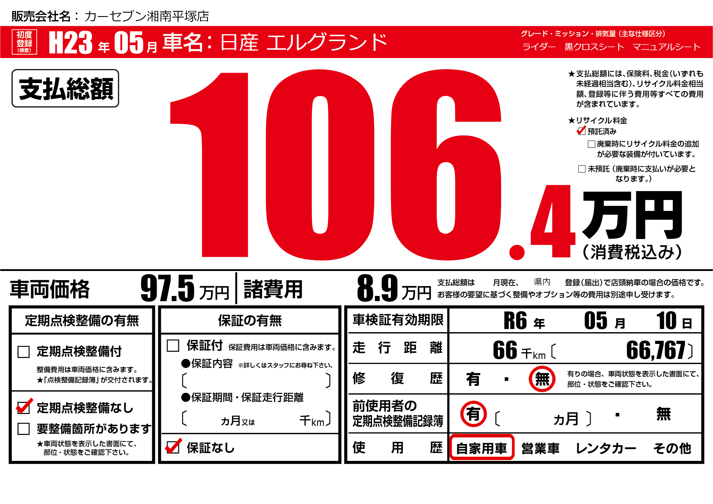 なし | 車検制限 | R6年05月10月 |