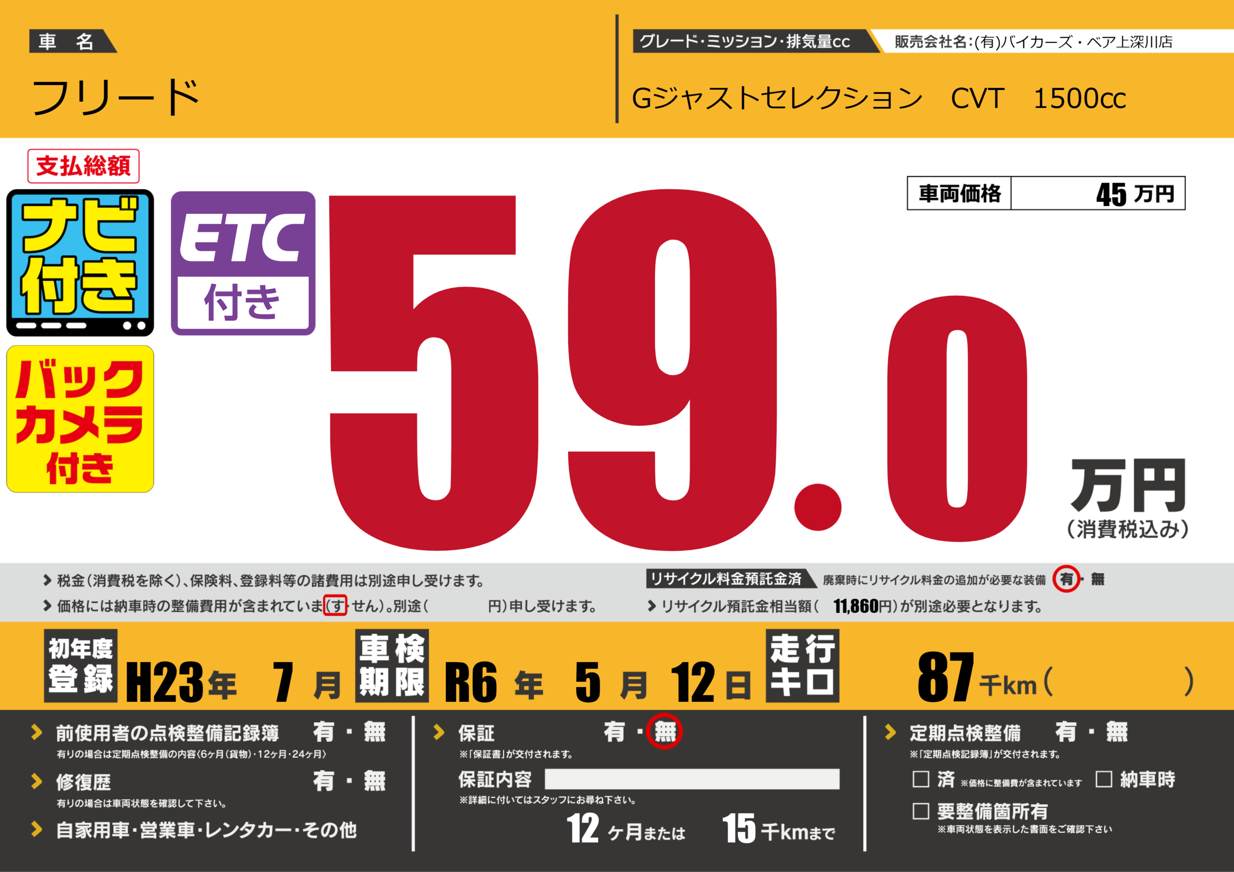 | 走行キロ | 8.7万km | 初年度登録 | H23年7月 |