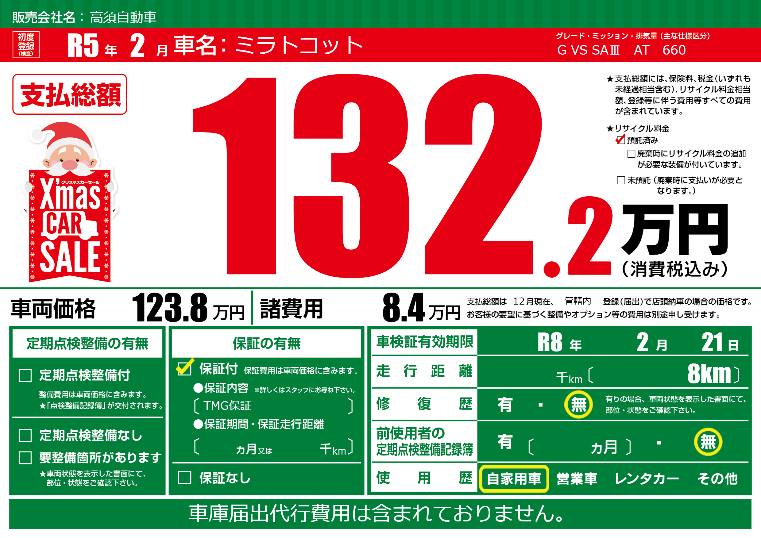 保証付き 保証内容(TMG保証) ---ヶ月または()千kmまで |