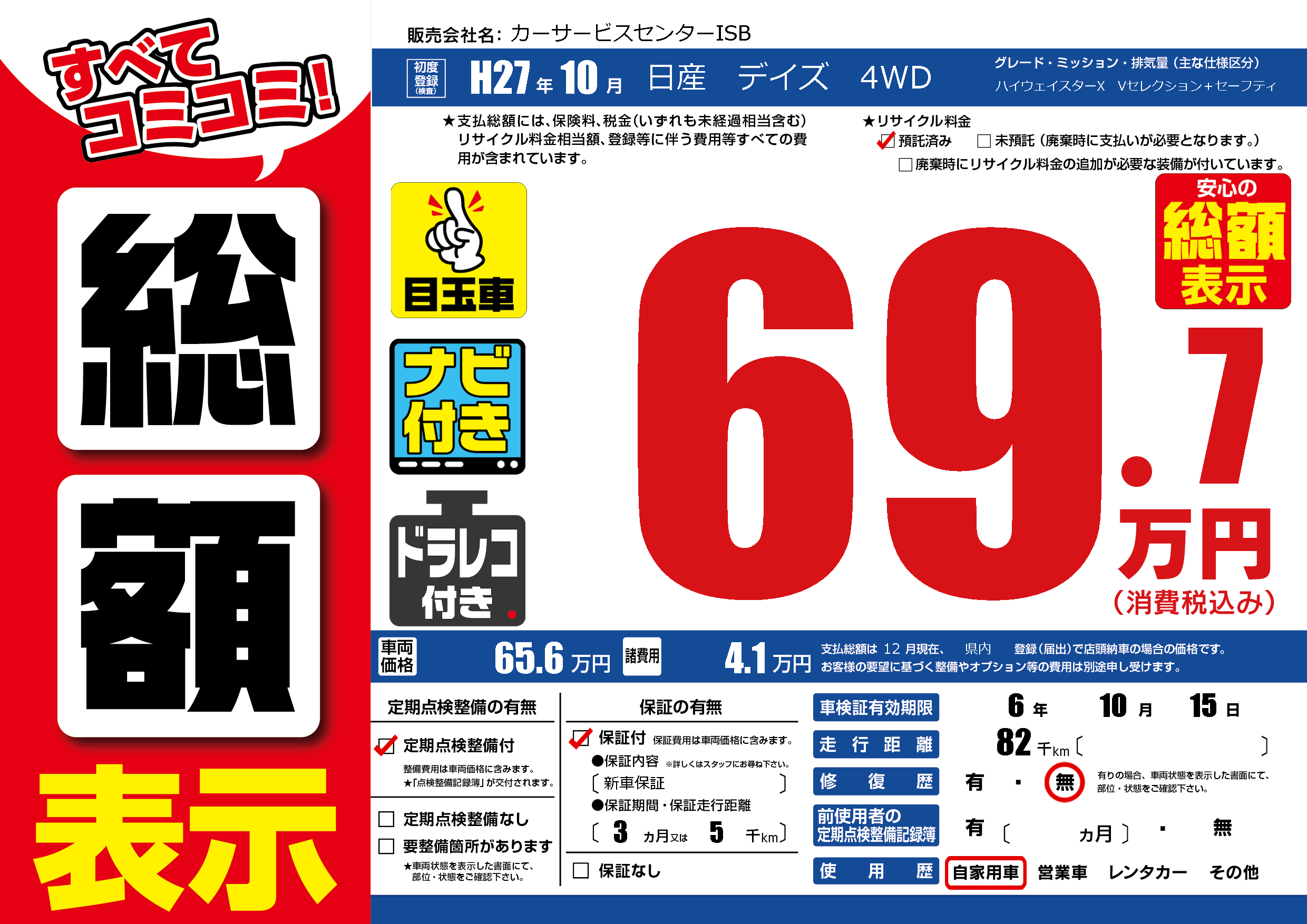 | 車名 | 日産 デイズ 4WD | グレード ミッション 排気量 |