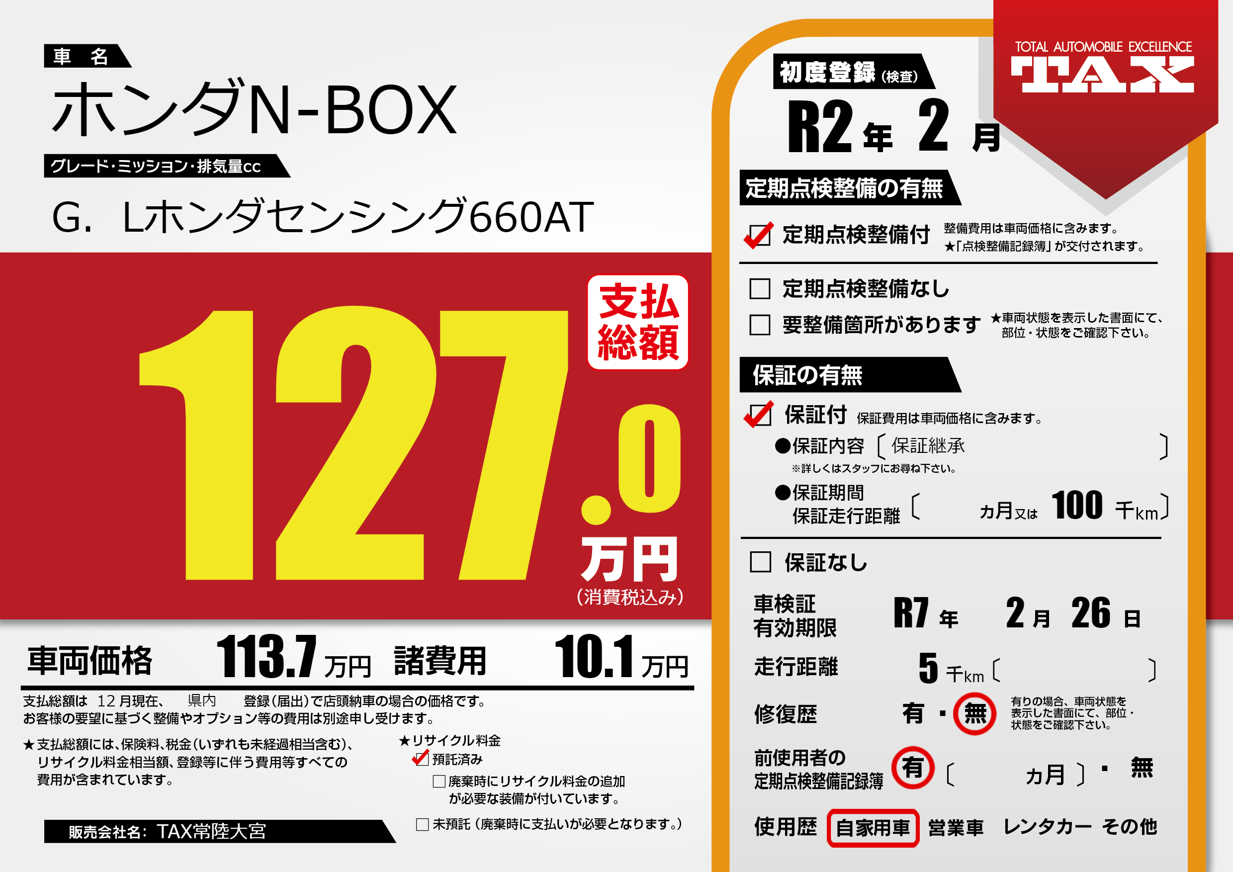 保証付き 保証内容(保証継承) ---ヶ月または(100)千kmまで |
