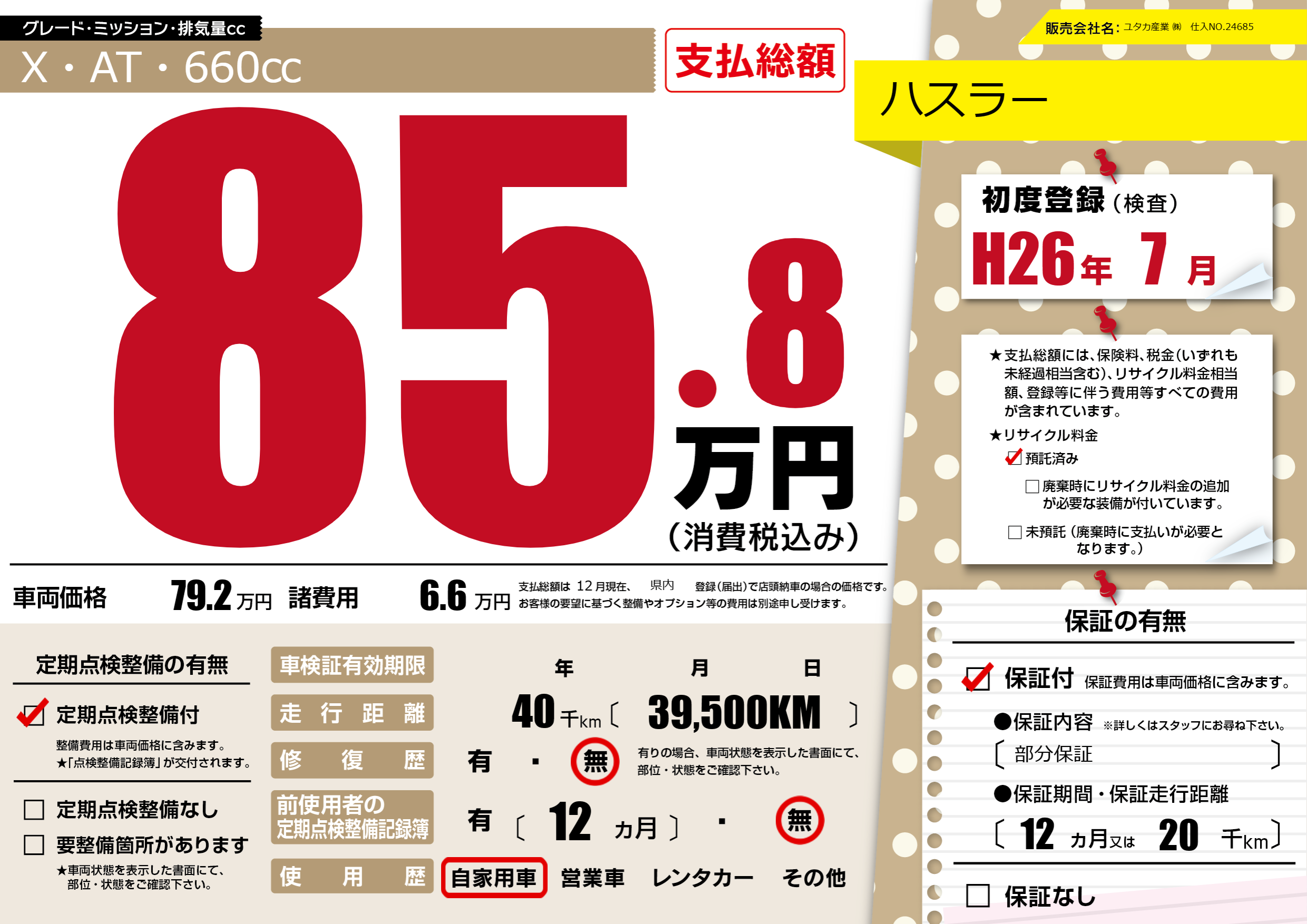 | 車名 | ハスラー | グレード ミッション 排気量 |