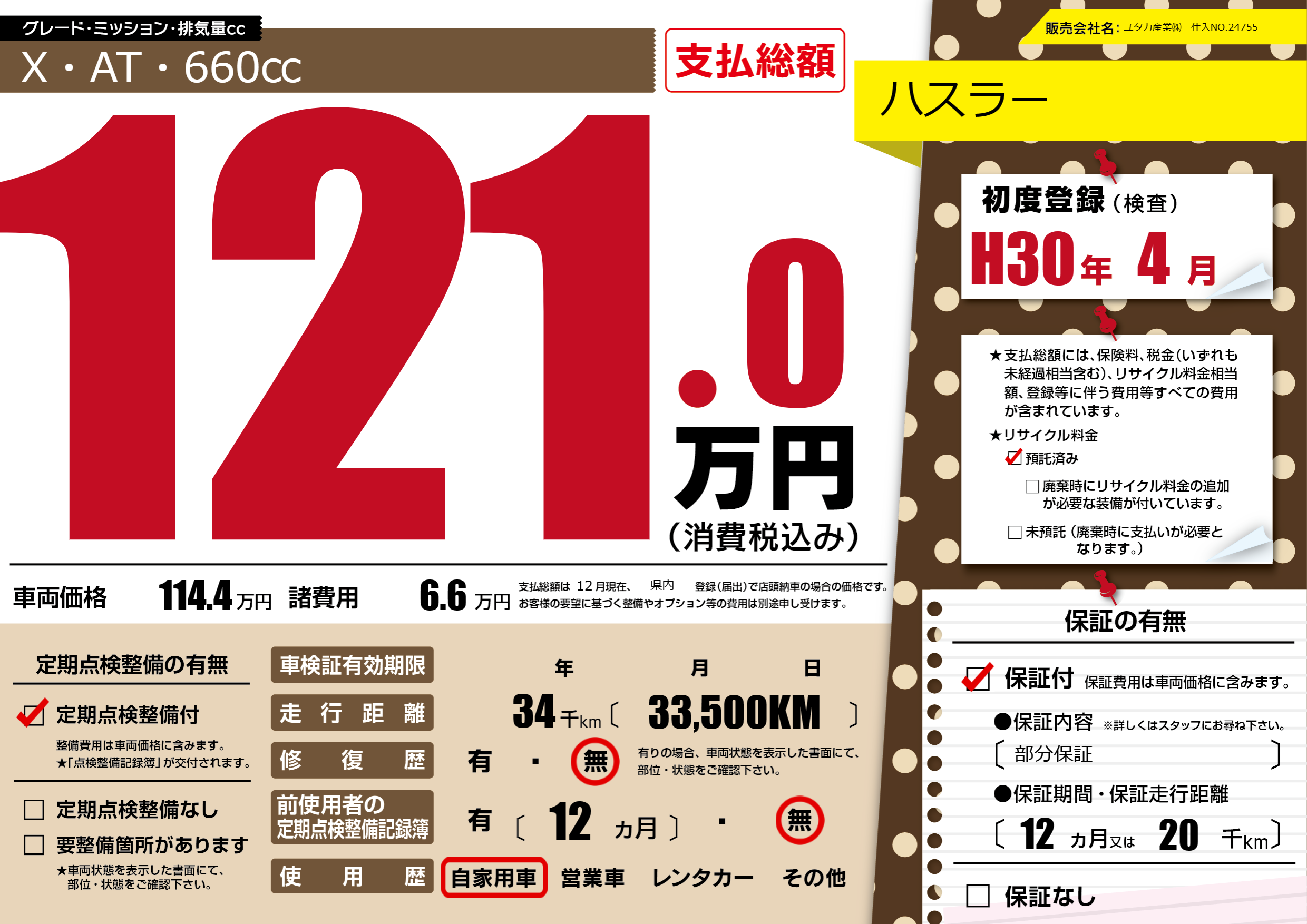 | 車名 | ハスラー | グレード ミッション 排気量 |