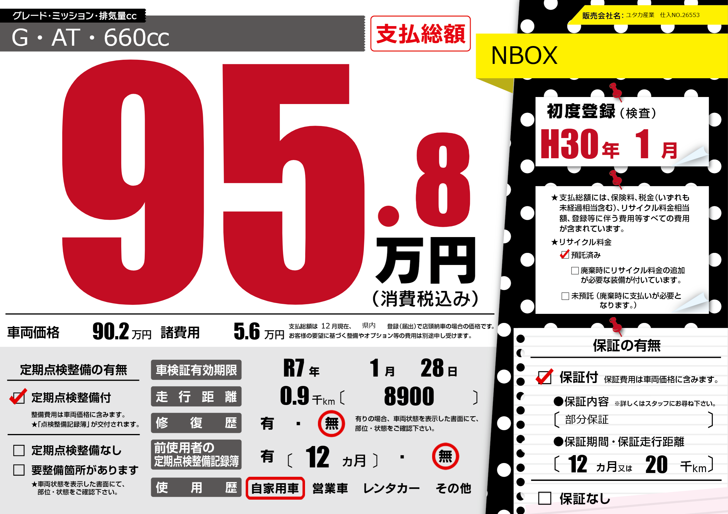 | 車名 | NBOX | グレード ミッション 排気量 |