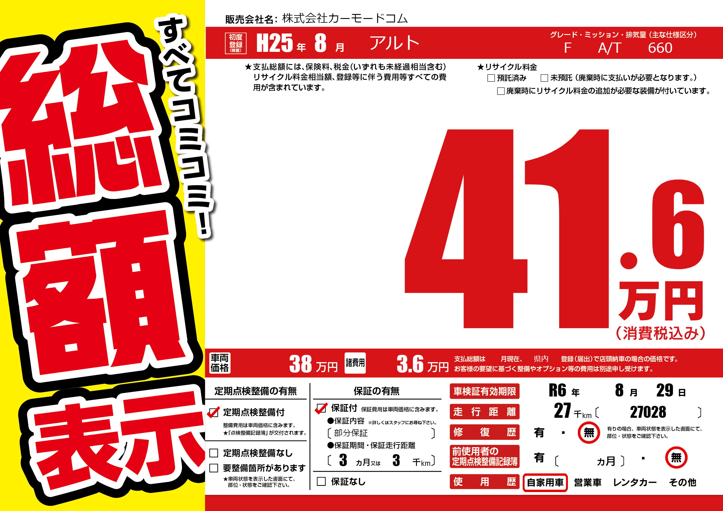 | 走行キロ | 2.7万km | 初年度登録 | H25年8月 |