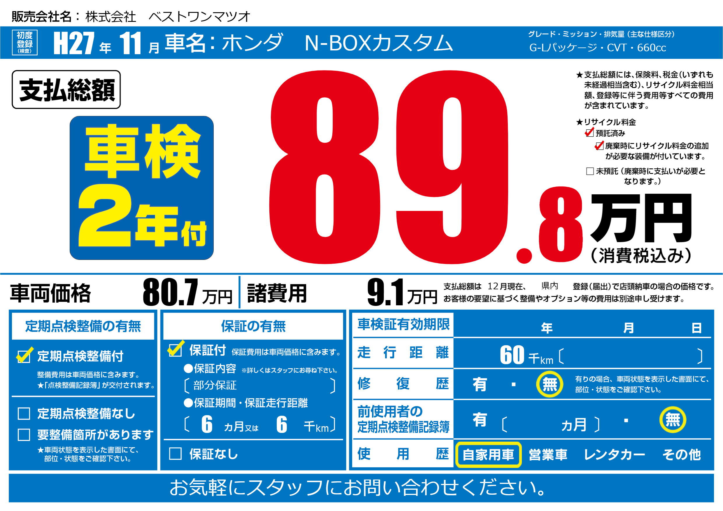 | 走行キロ | 6万km | 初年度登録 | H27年11月 |