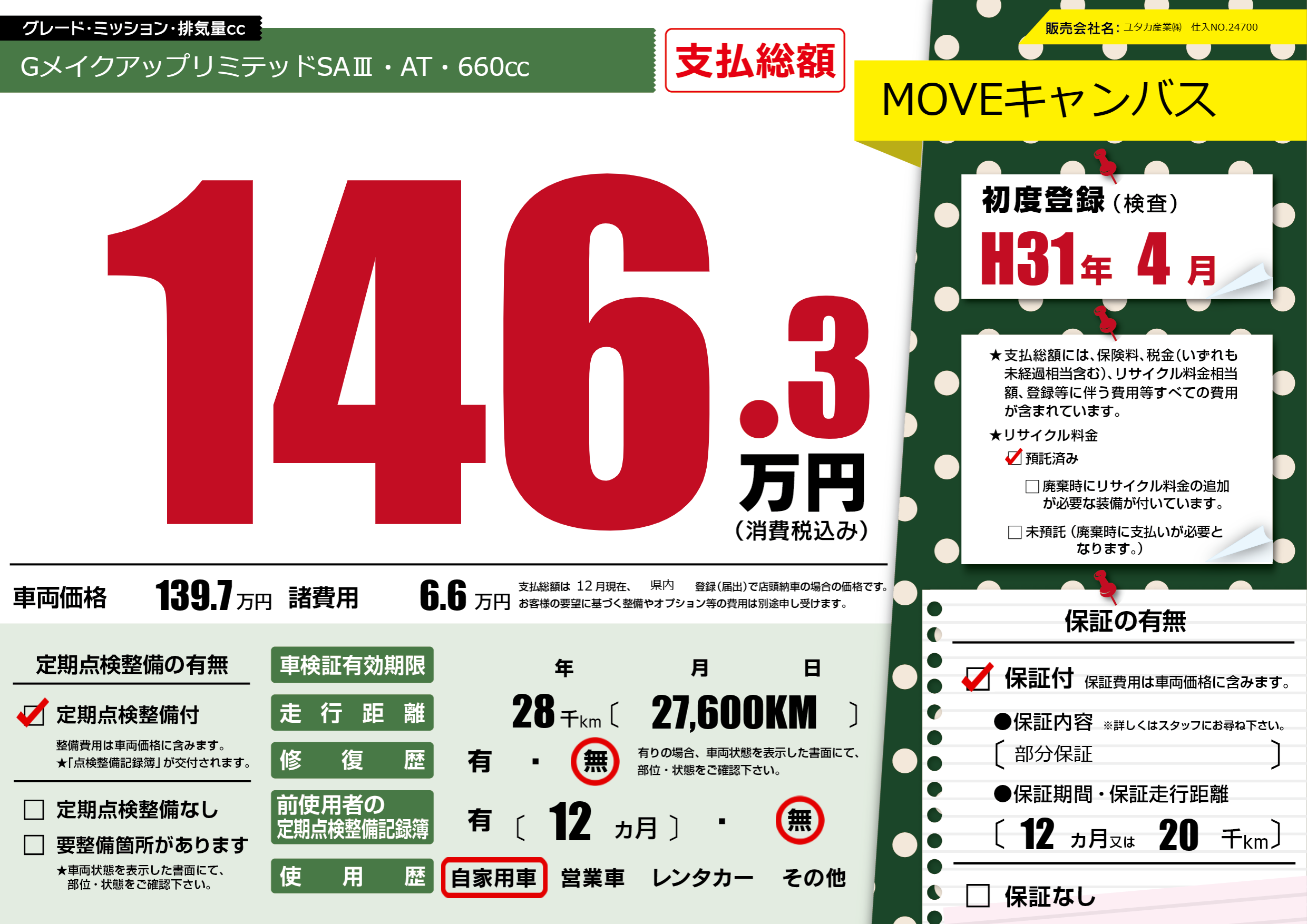 | 走行キロ | 2.8万km | 初年度登録 | H31年4月 |