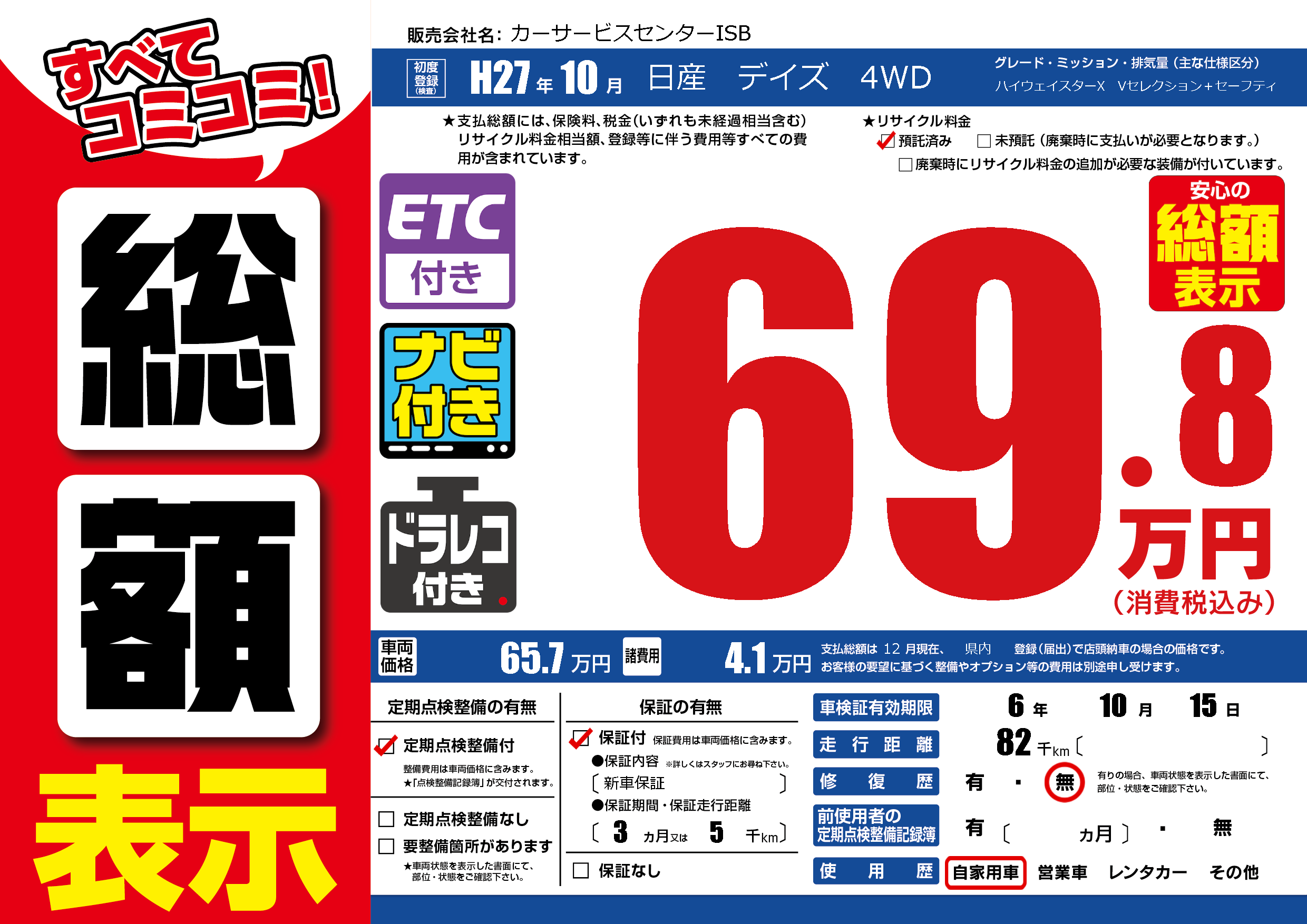 | 走行キロ | 8.2万km | 初年度登録 | H27年10月 |