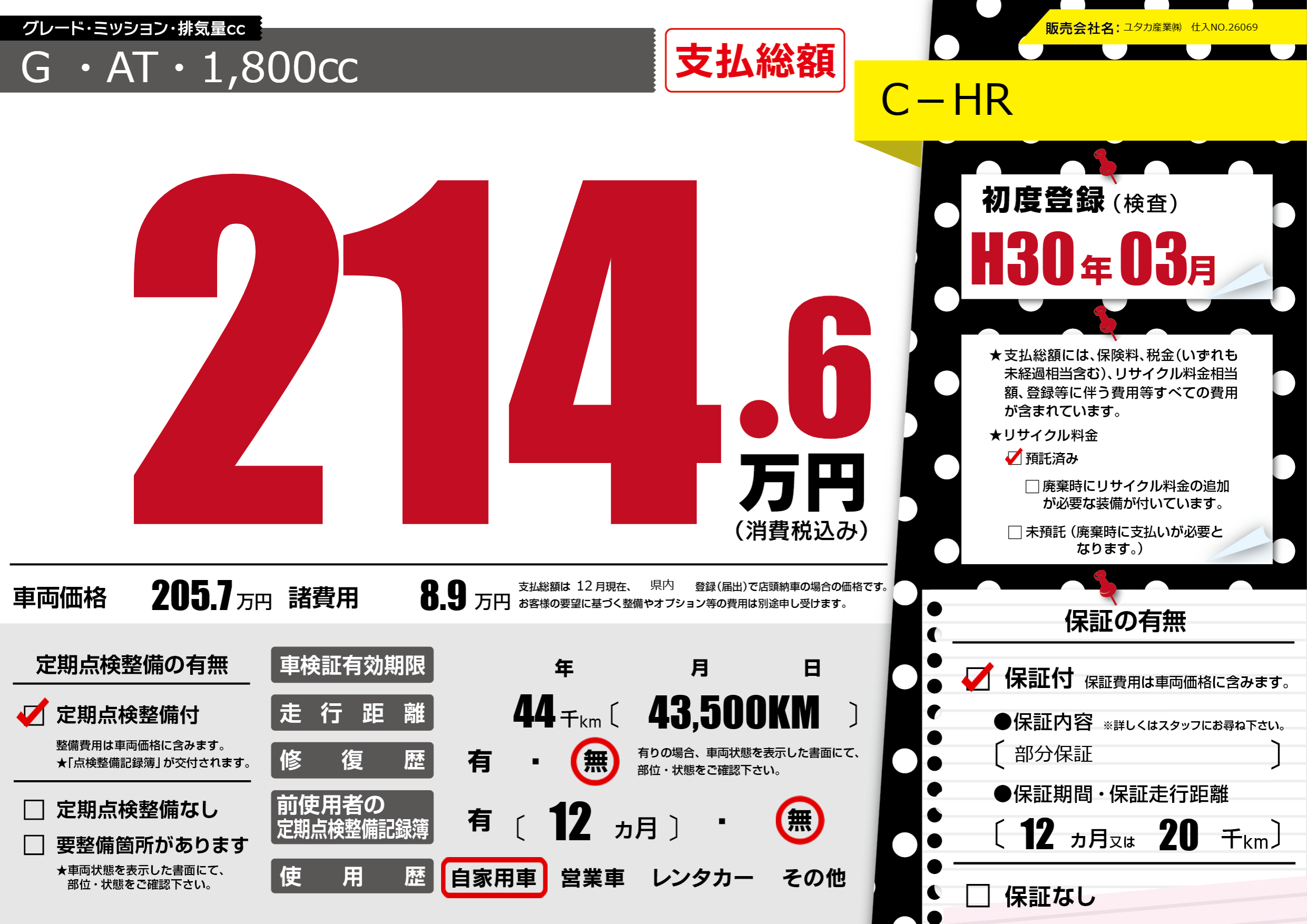 | 車名 | C-HR | グレード ミッション 排気量 |