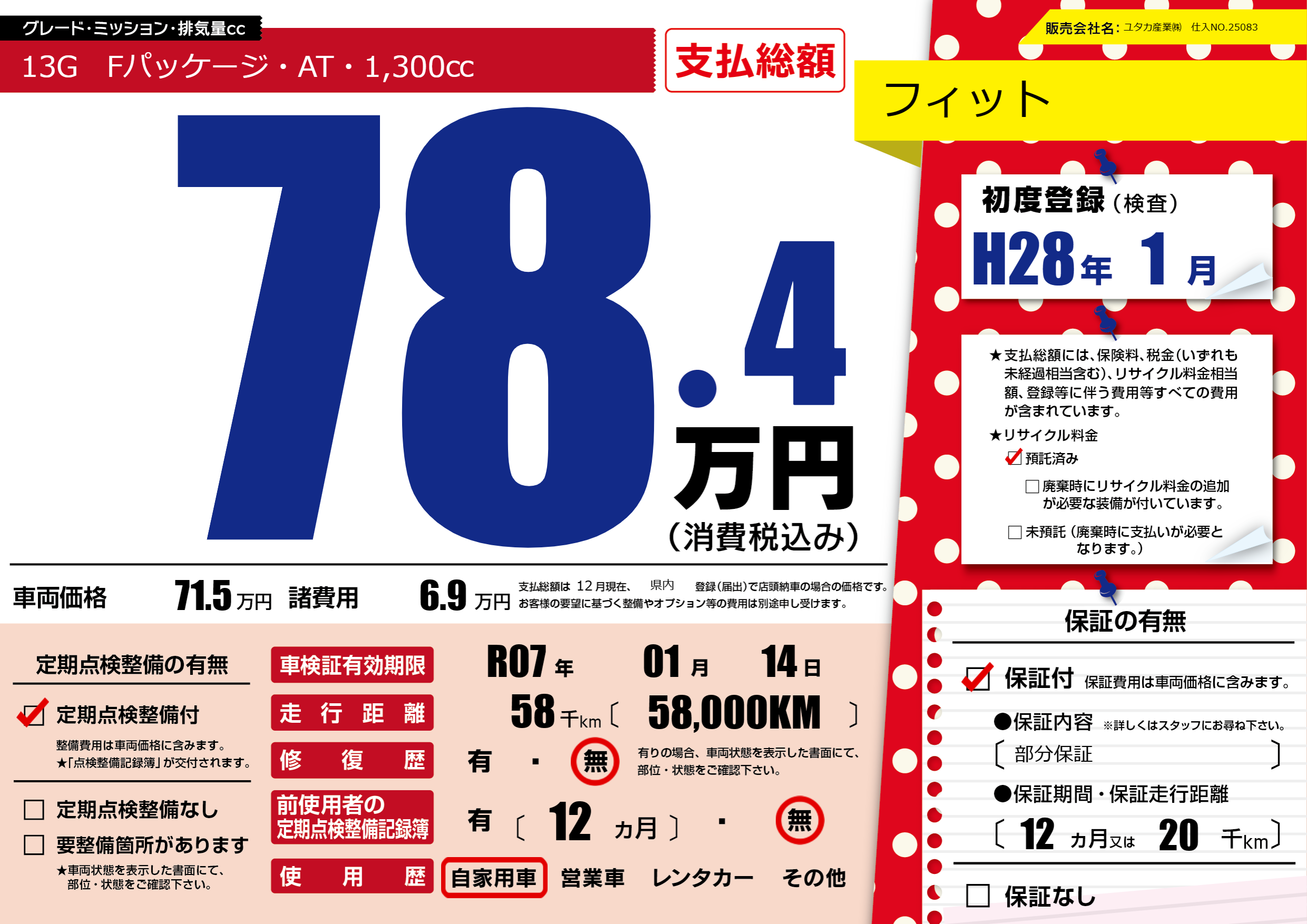 | 走行キロ | 5.8万km | 初年度登録 | H28年1月 |