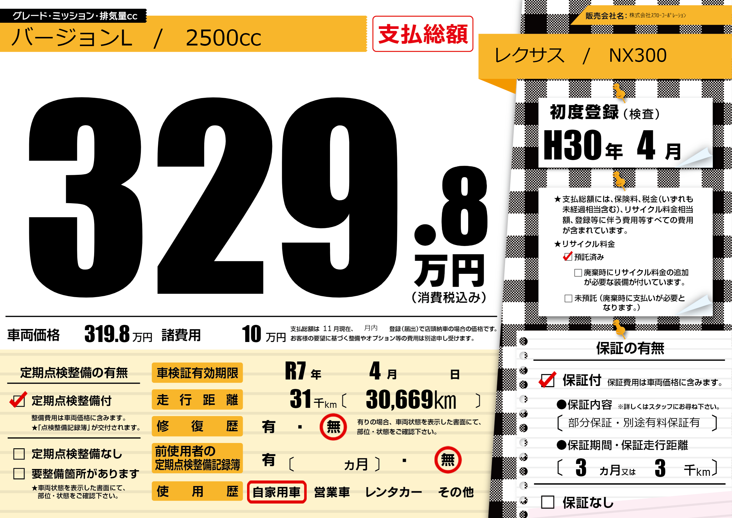 保証付き 保証内容(部分保証・別途有料保証有) 3ヶ月または(3)千kmまで |