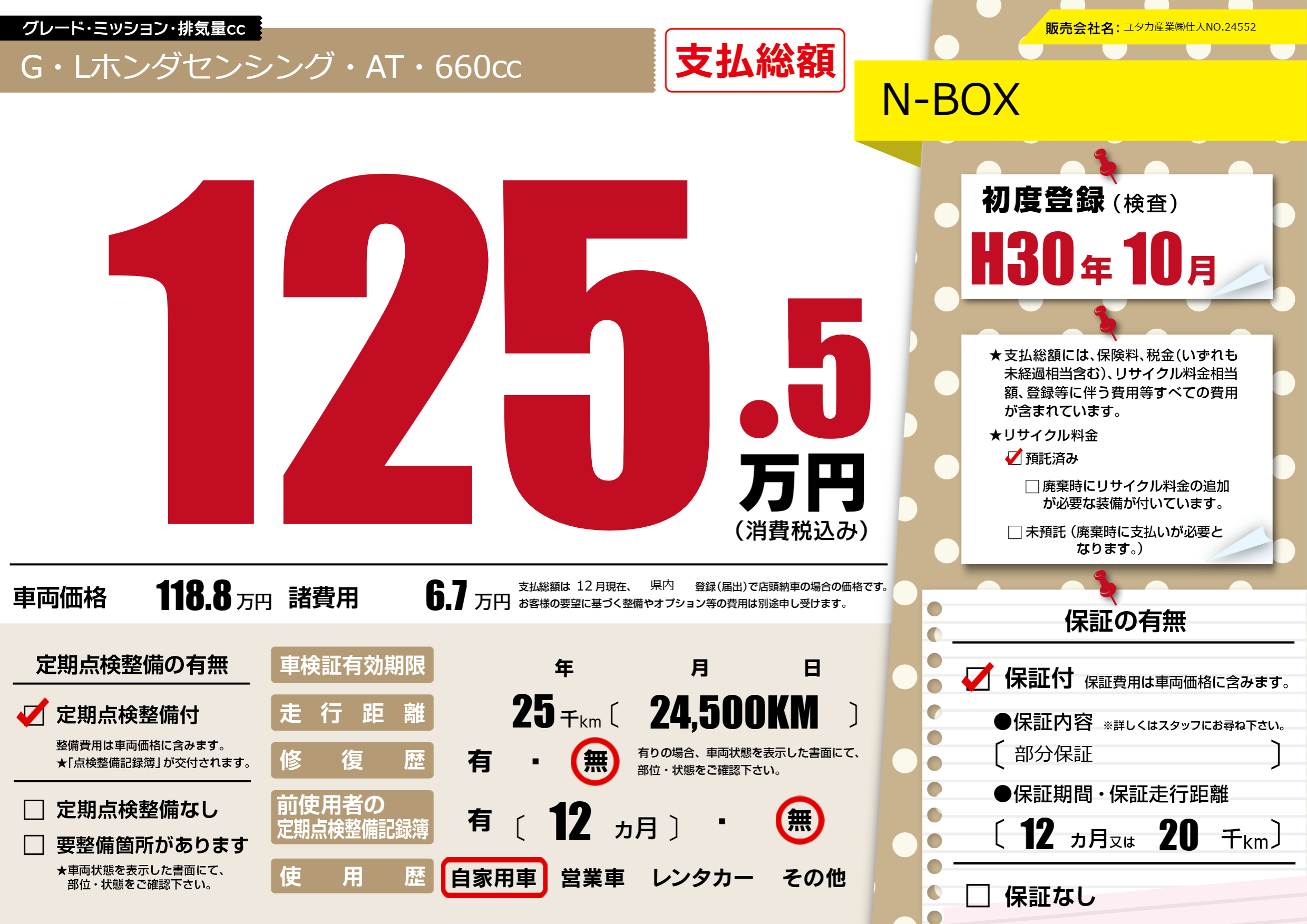 | 車名 | N-BOX | グレード ミッション 排気量 |