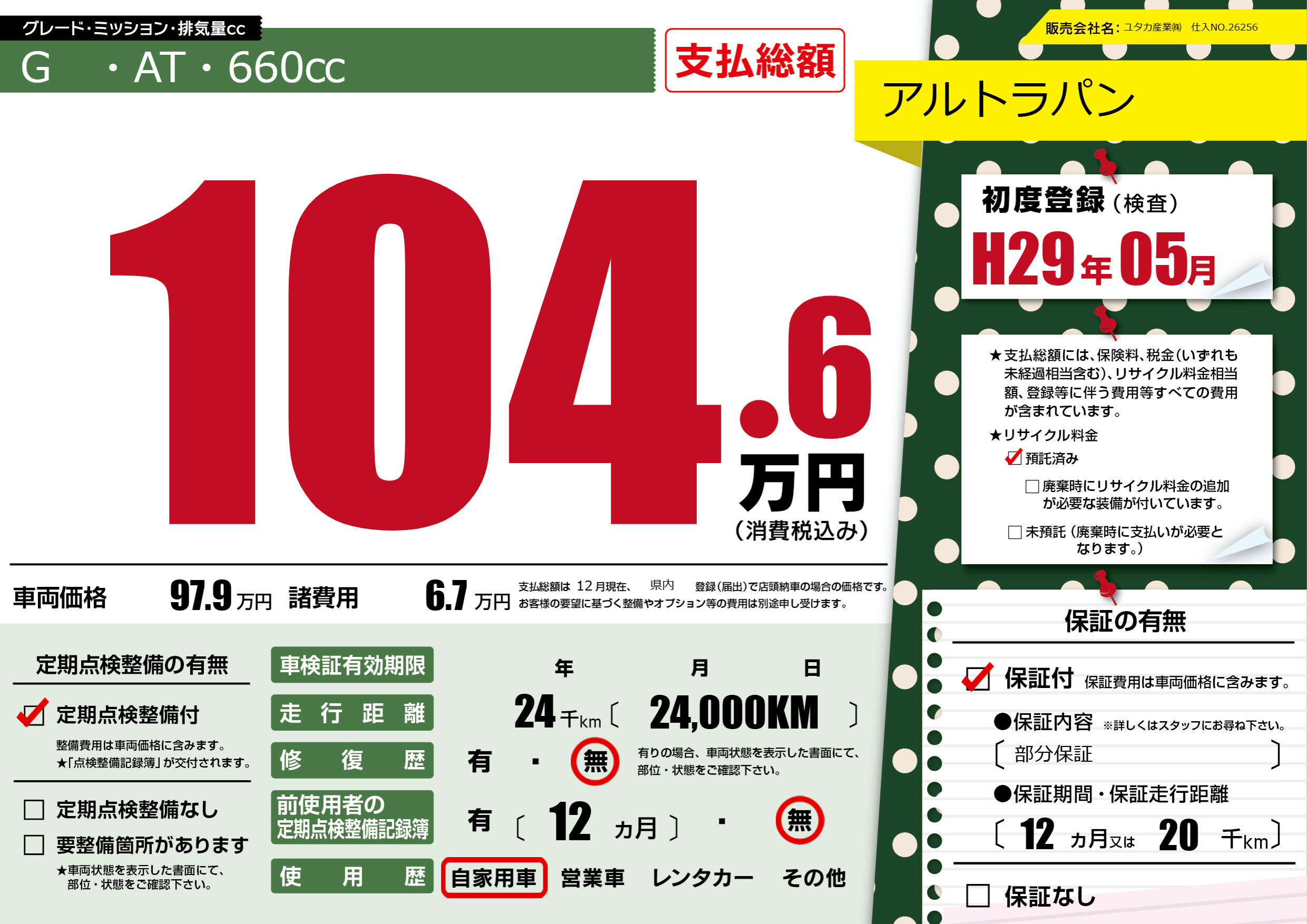| 走行キロ | 2.4万km | 初年度登録 | H29年05月 |