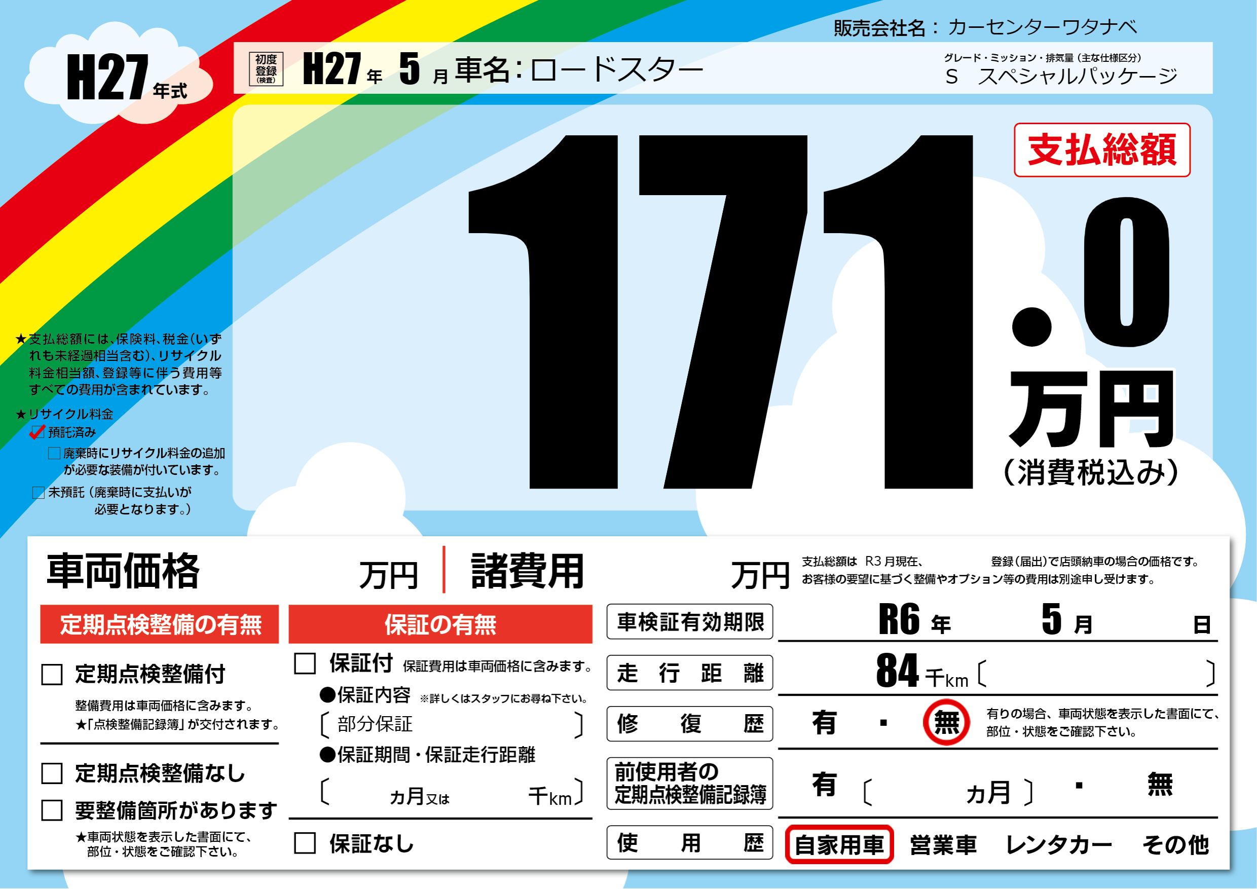 | 車名 | ロードスター | グレード ミッション 排気量 |