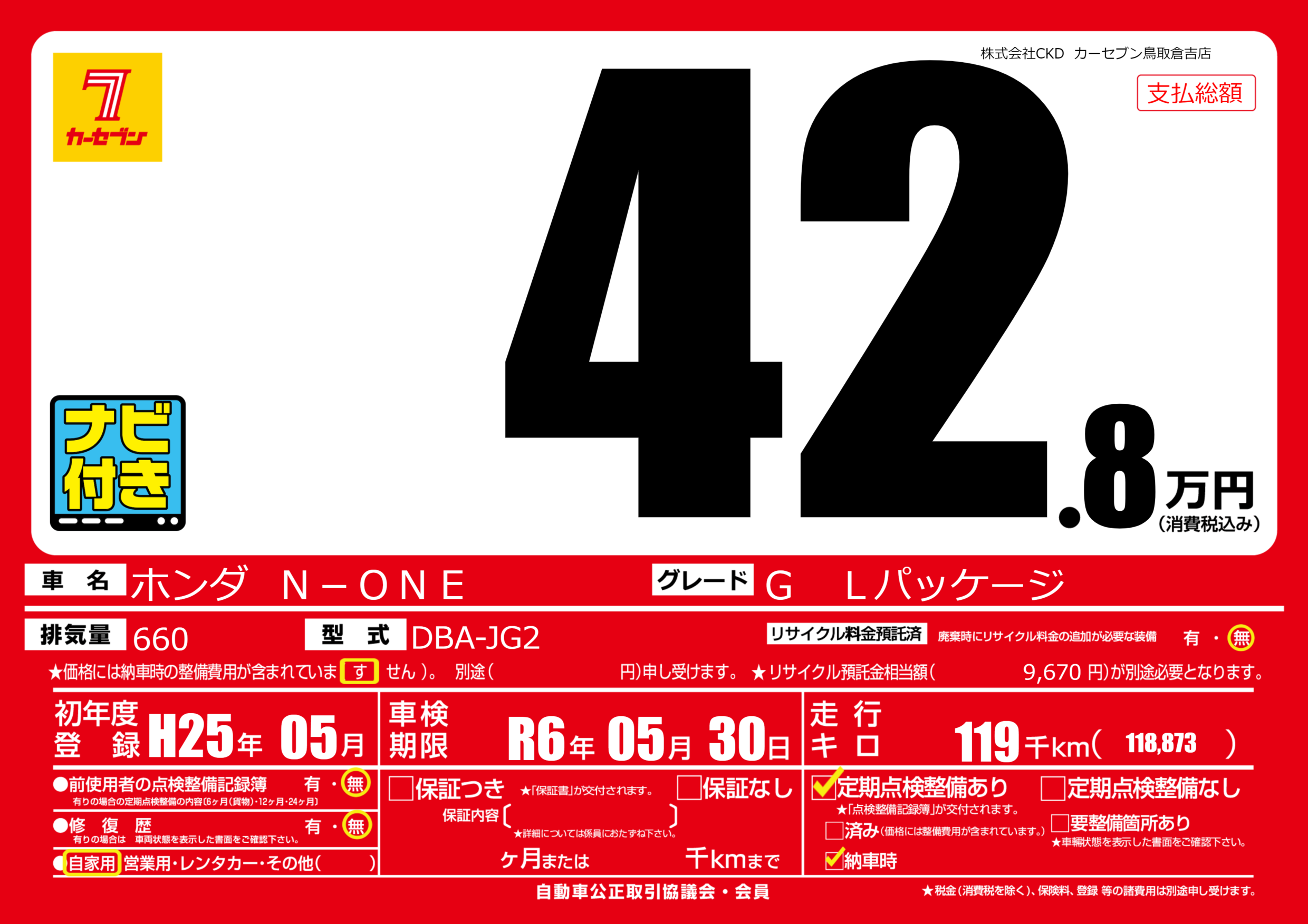 | 車名 | ホンダ N-ONE | グレード ミッション 排気量 |