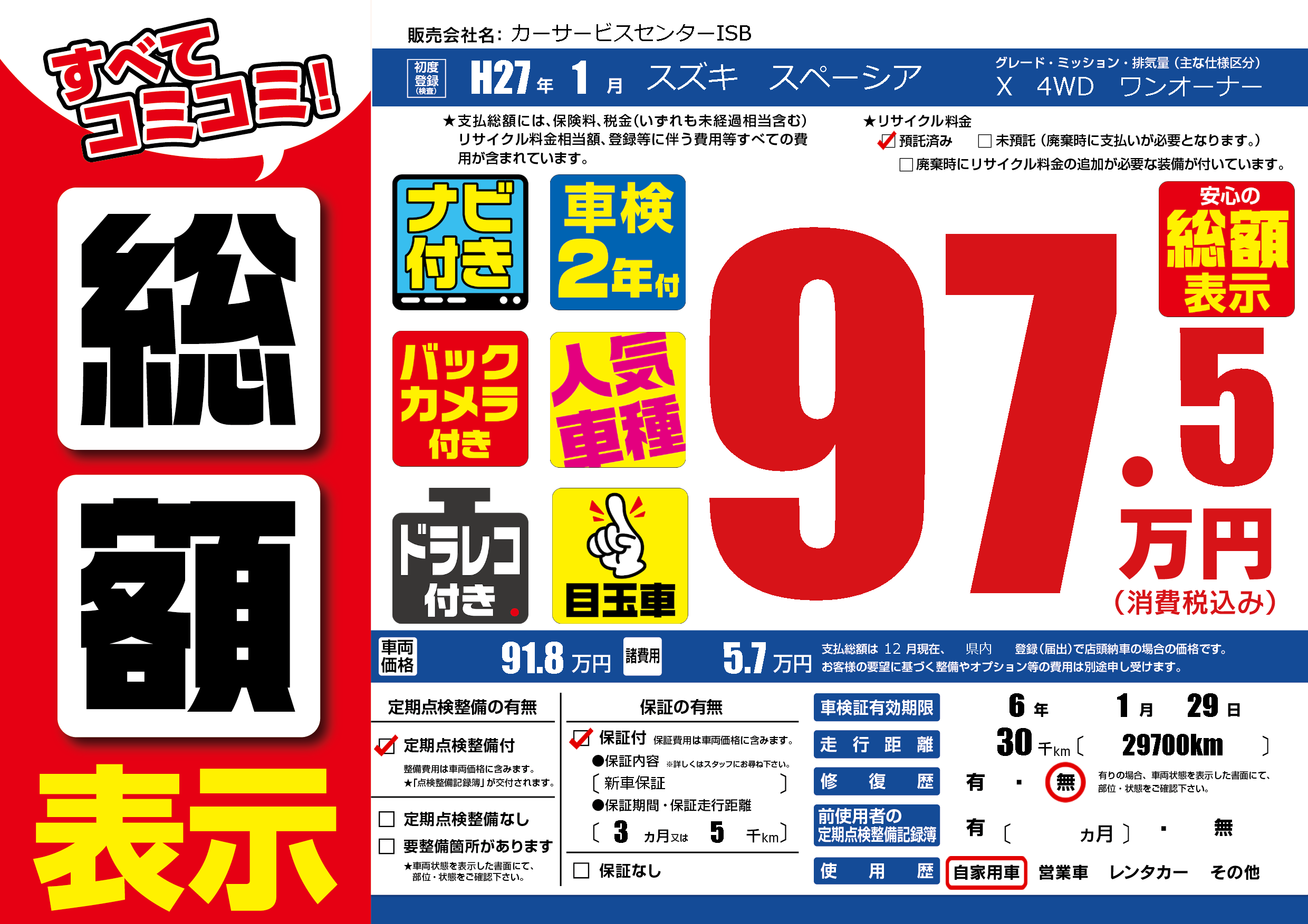 | 走行キロ | 3万km | 初年度登録 | H27年1月 |
