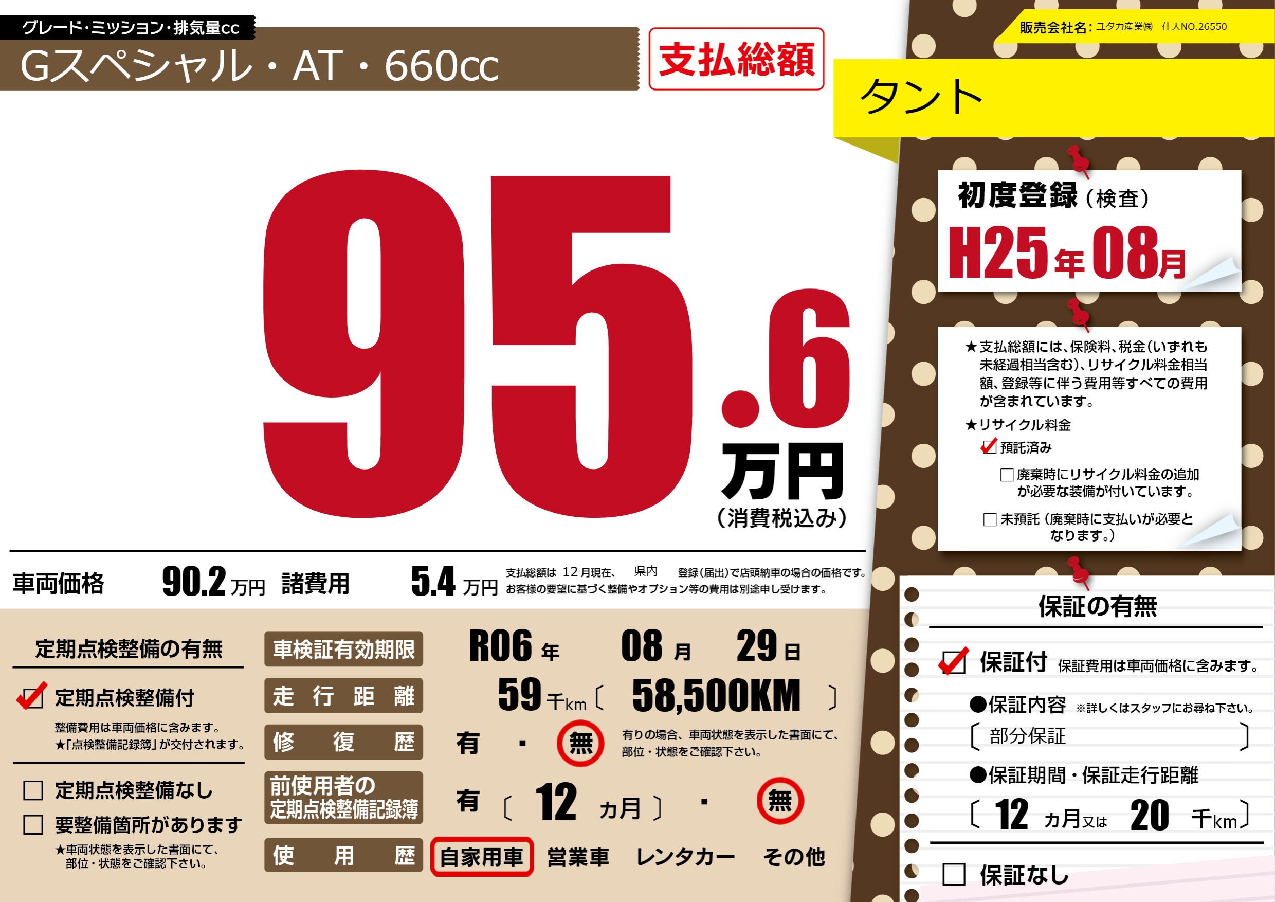| 走行キロ | 5.9万km | 初年度登録 | H25年08月 |