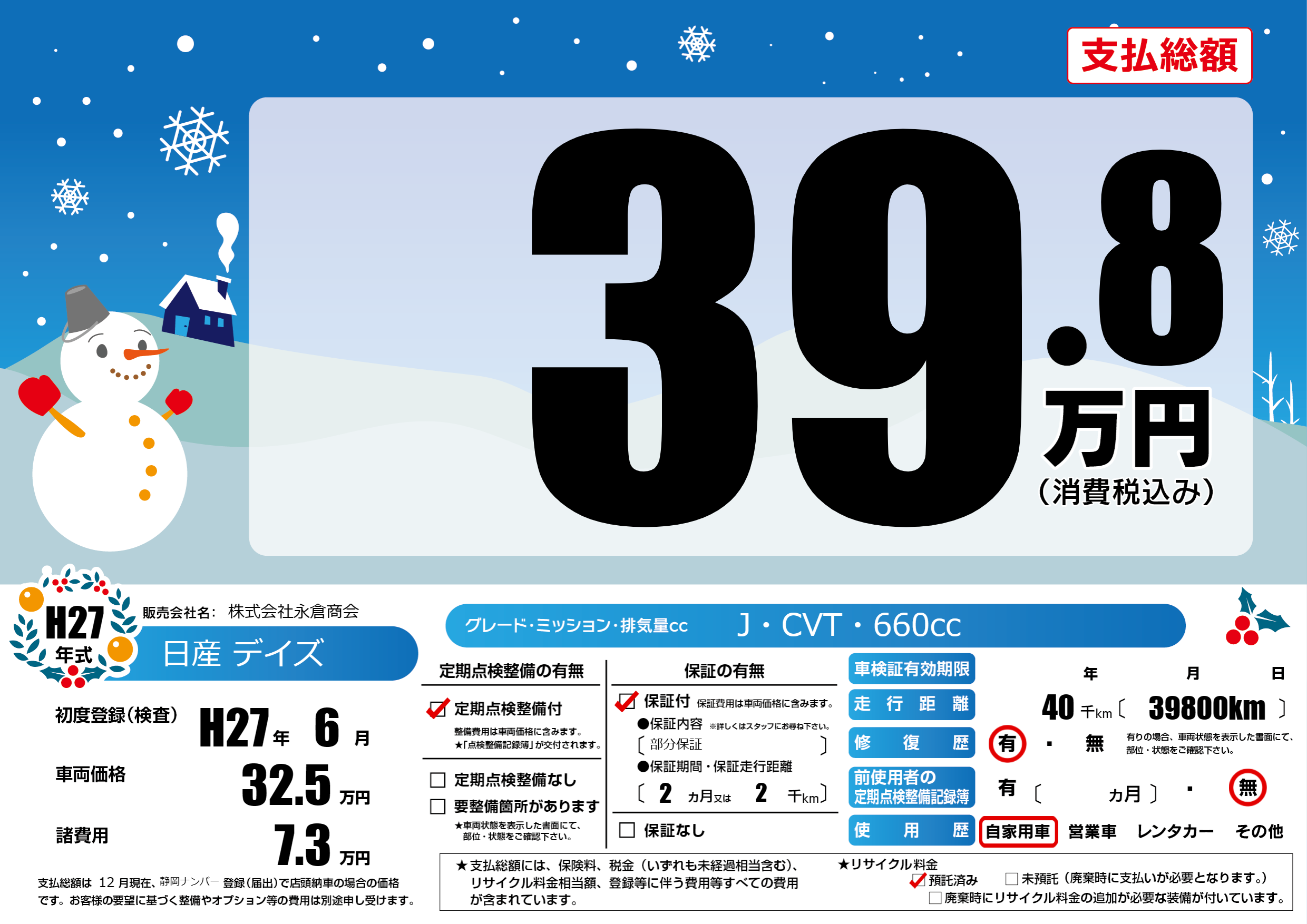 | 車名 | 日産 デイズ | グレード ミッション 排気量 |