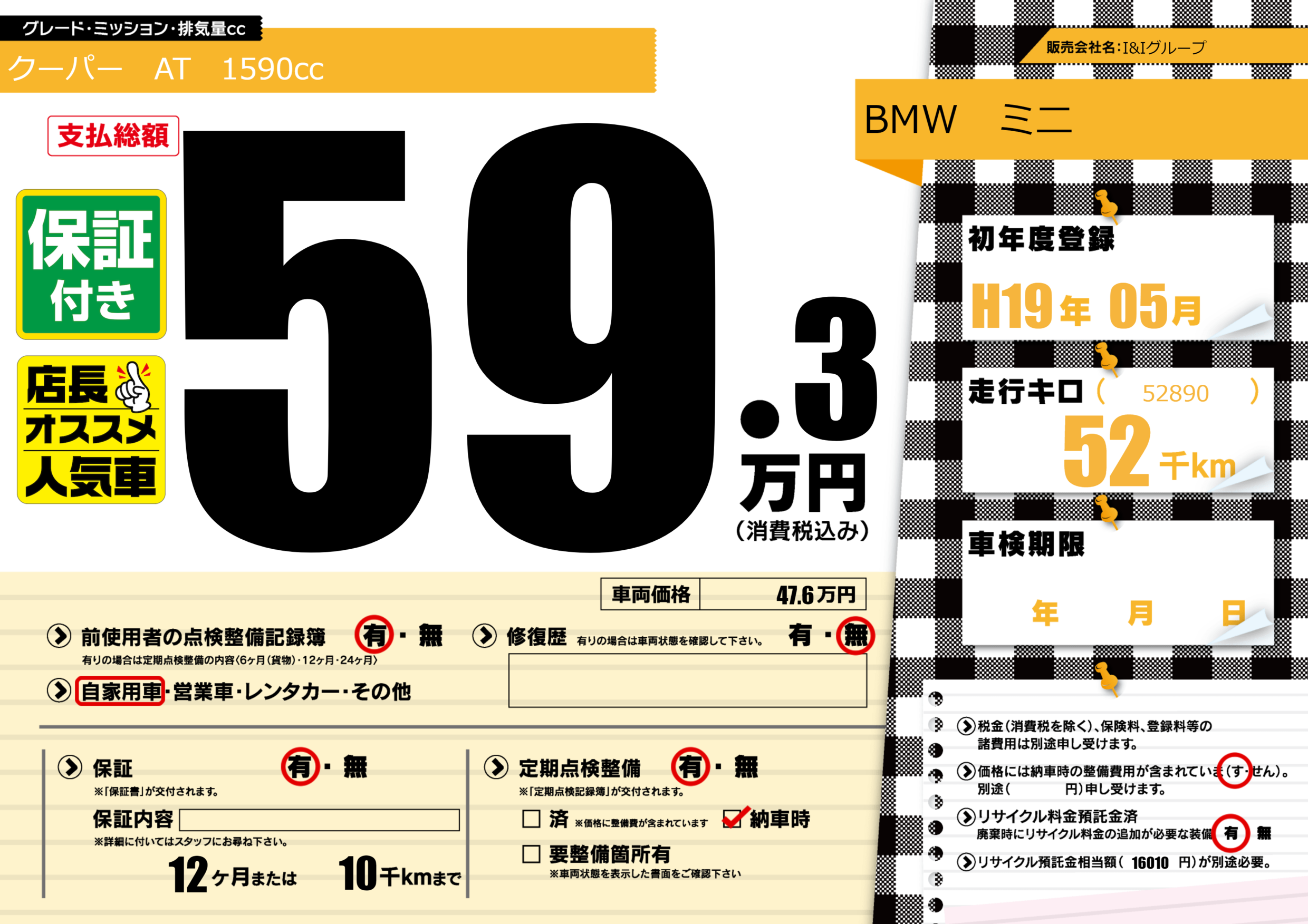 | 車名 | BMW ミニ | グレード ミッション 排気量 |