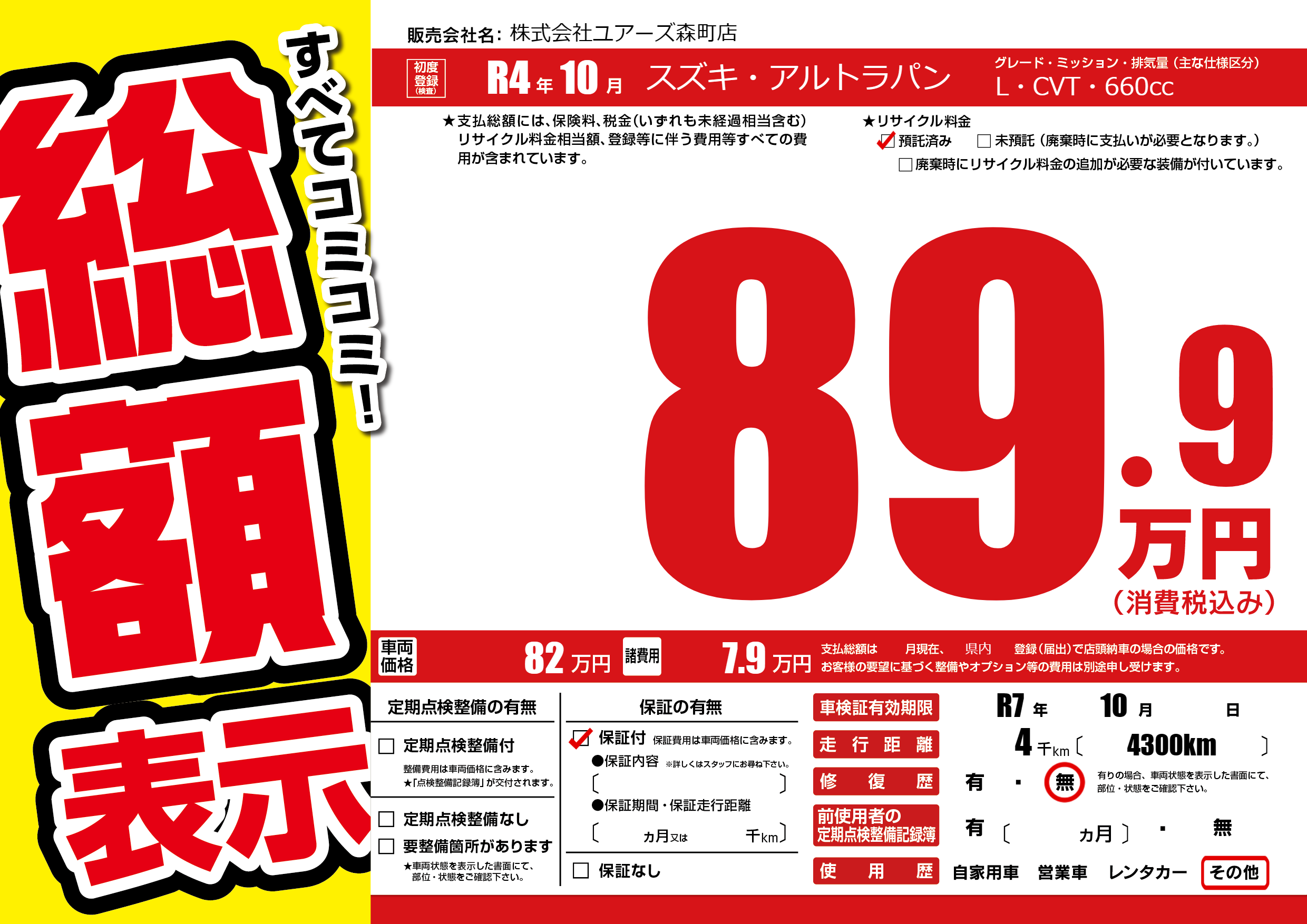 なし | 車検制限 | R7年10月---月 |