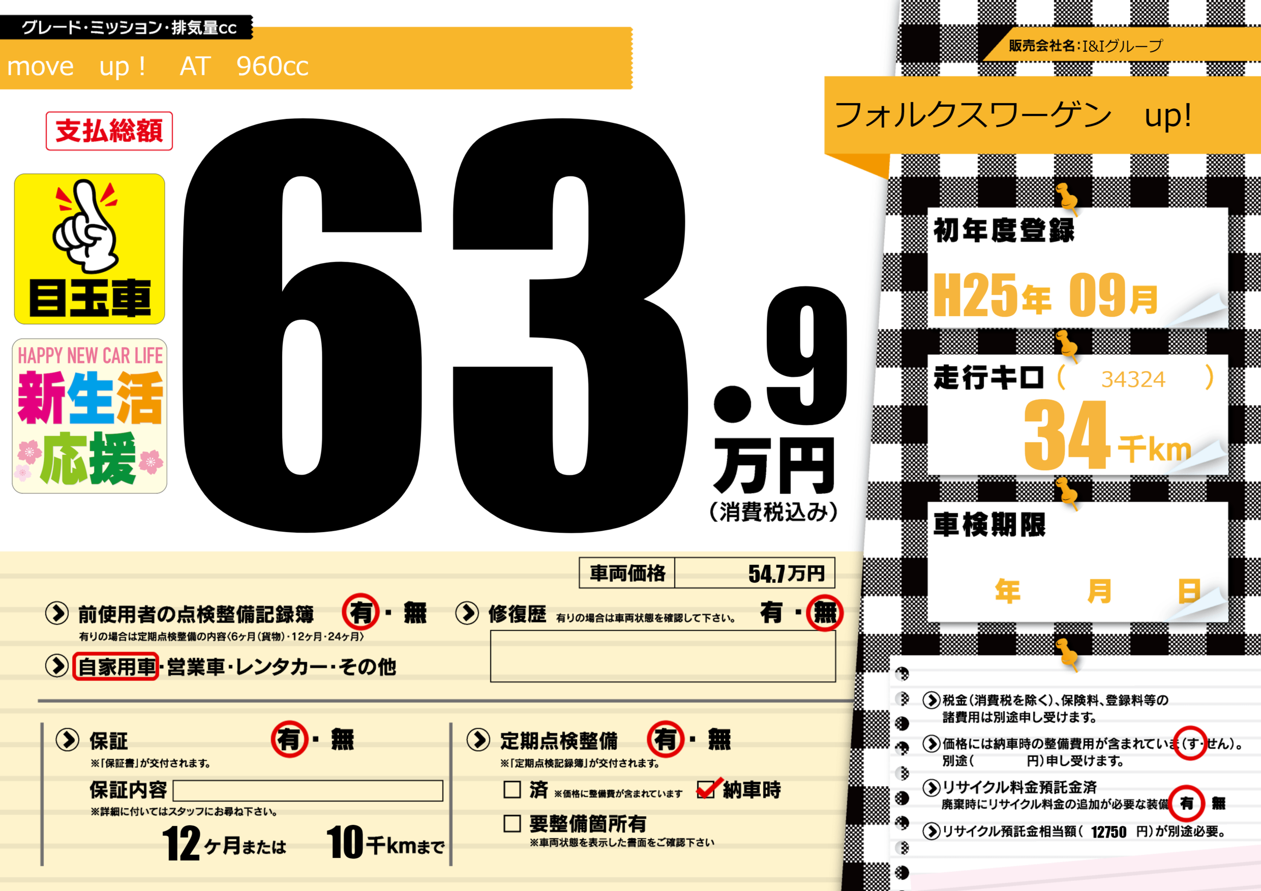 | 車名 | フォルクスワーゲン up! | グレード ミッション 排気量 |