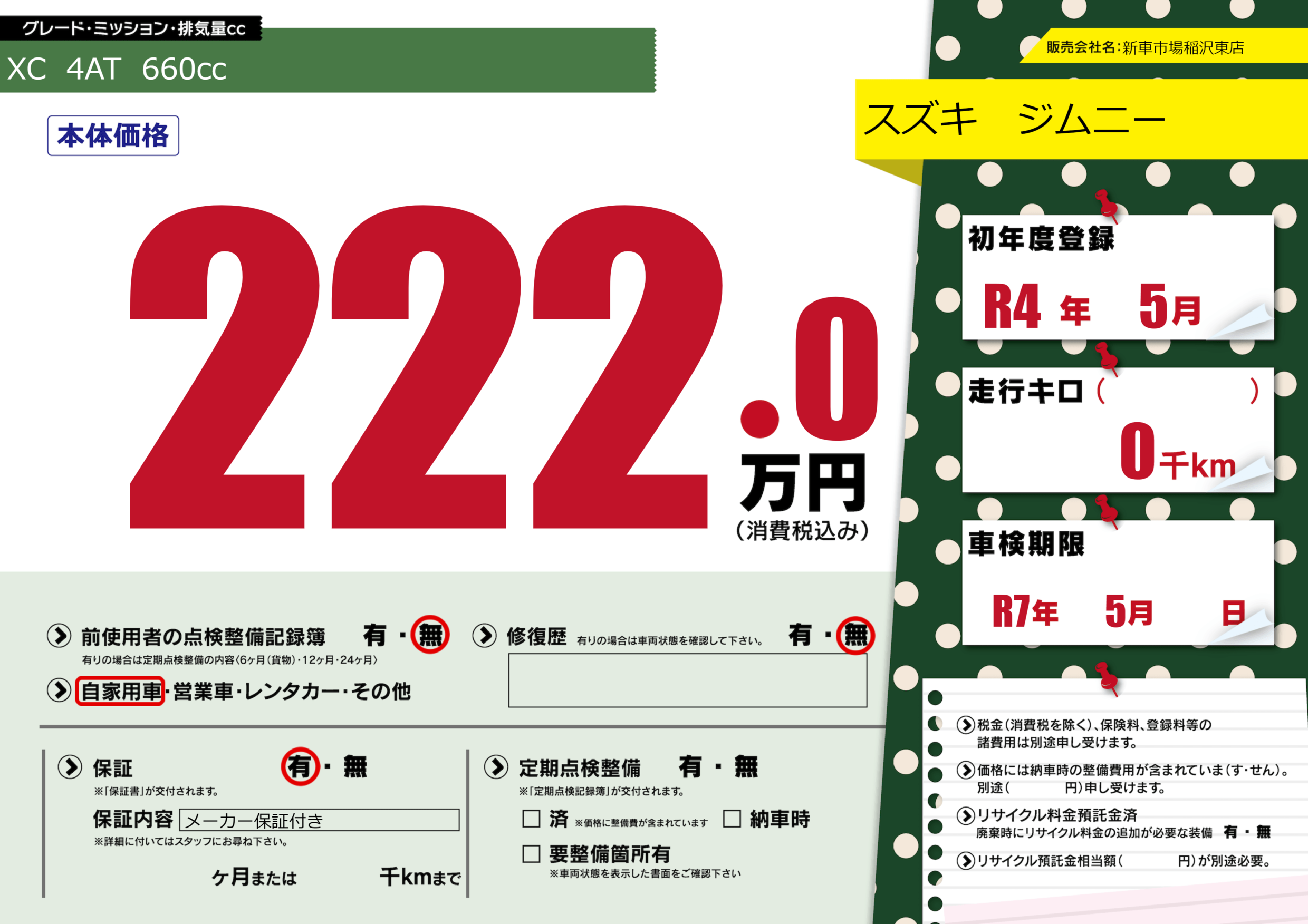 | 車名 | スズキ ジムニー | グレード ミッション 排気量 |