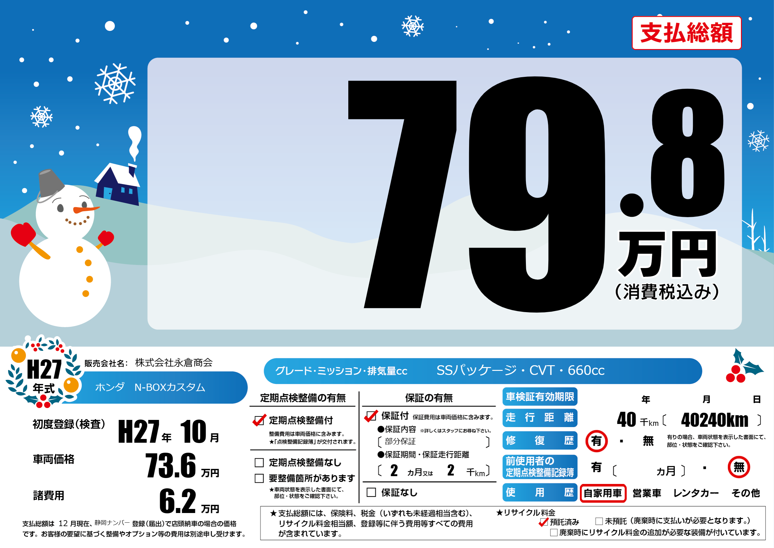 | 車名 | ホンダ N-BOXカスタム | グレード ミッション 排気量 |