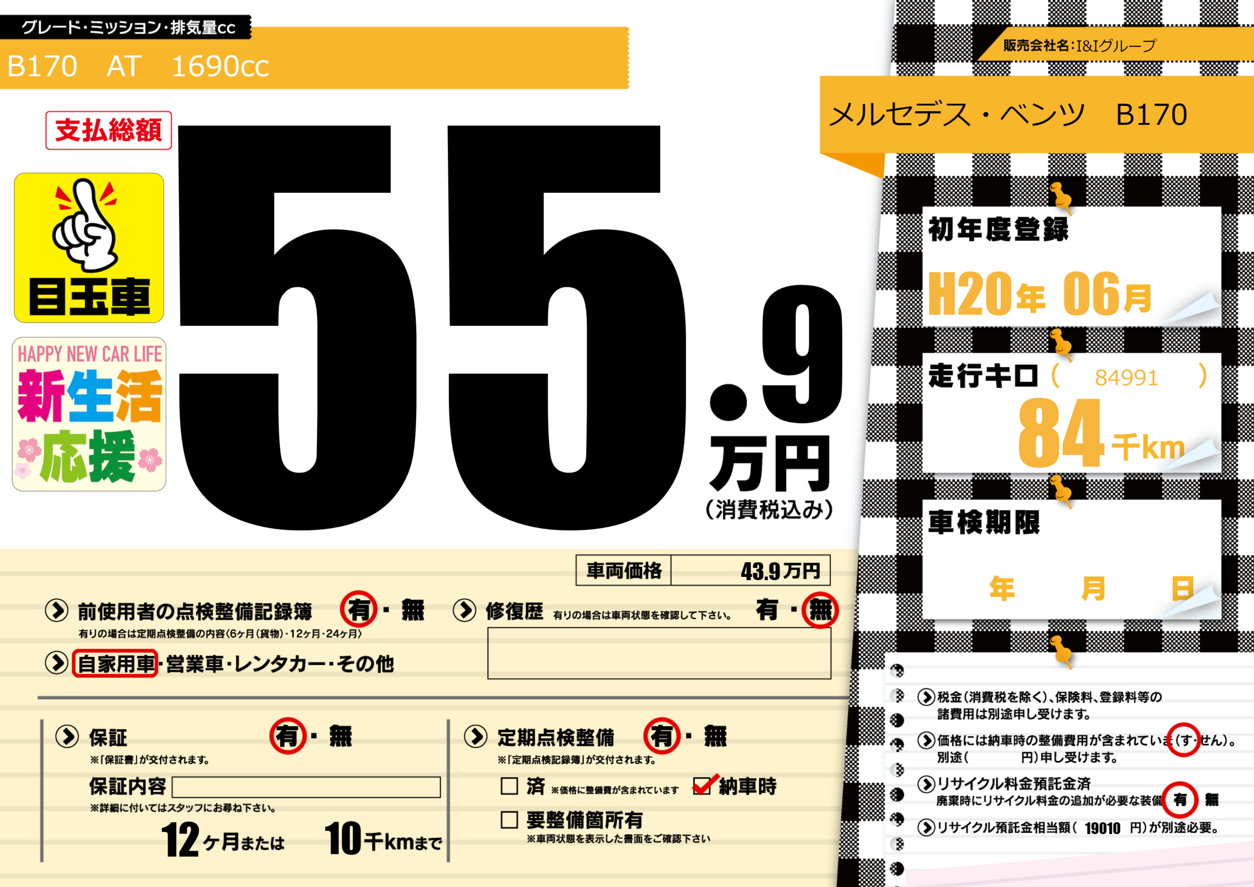 | 車名 | メルセデス・ベンツ B170 | グレード ミッション 排気量 |