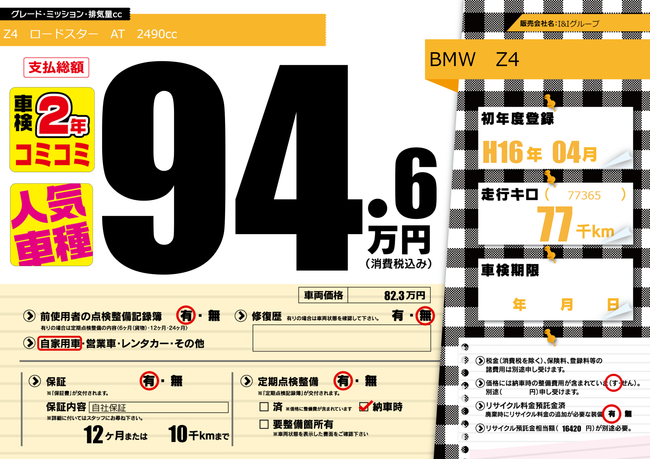 | 車名 | BMW Z4 | グレード ミッション 排気量 |