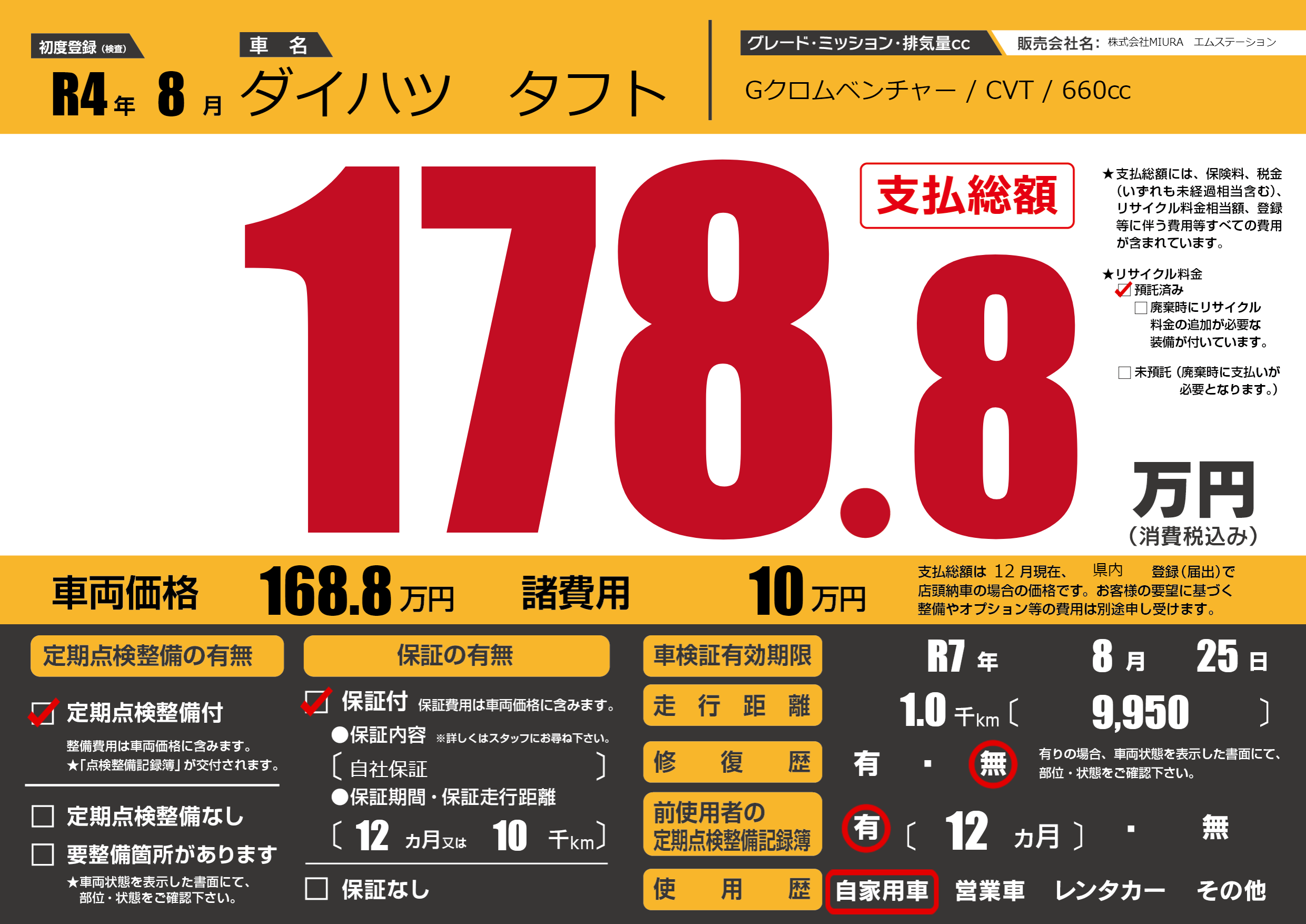| 車検制限 | R7年 8月 25日 | ||