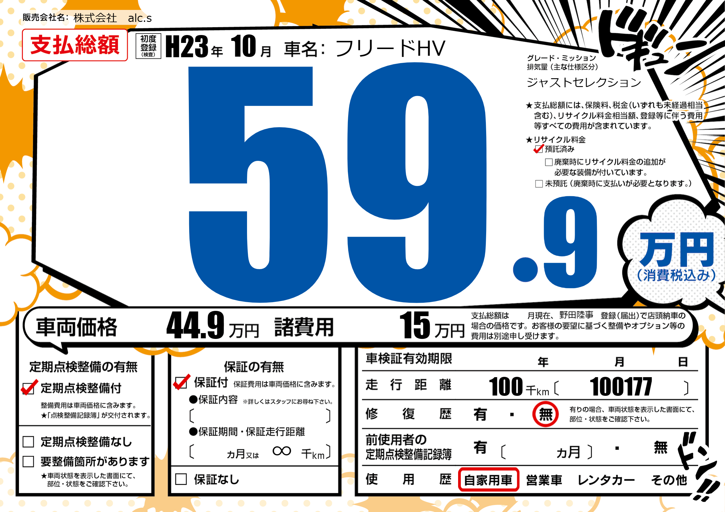| 走行キロ | 10万km | 初年度登録 | H23年10月 |