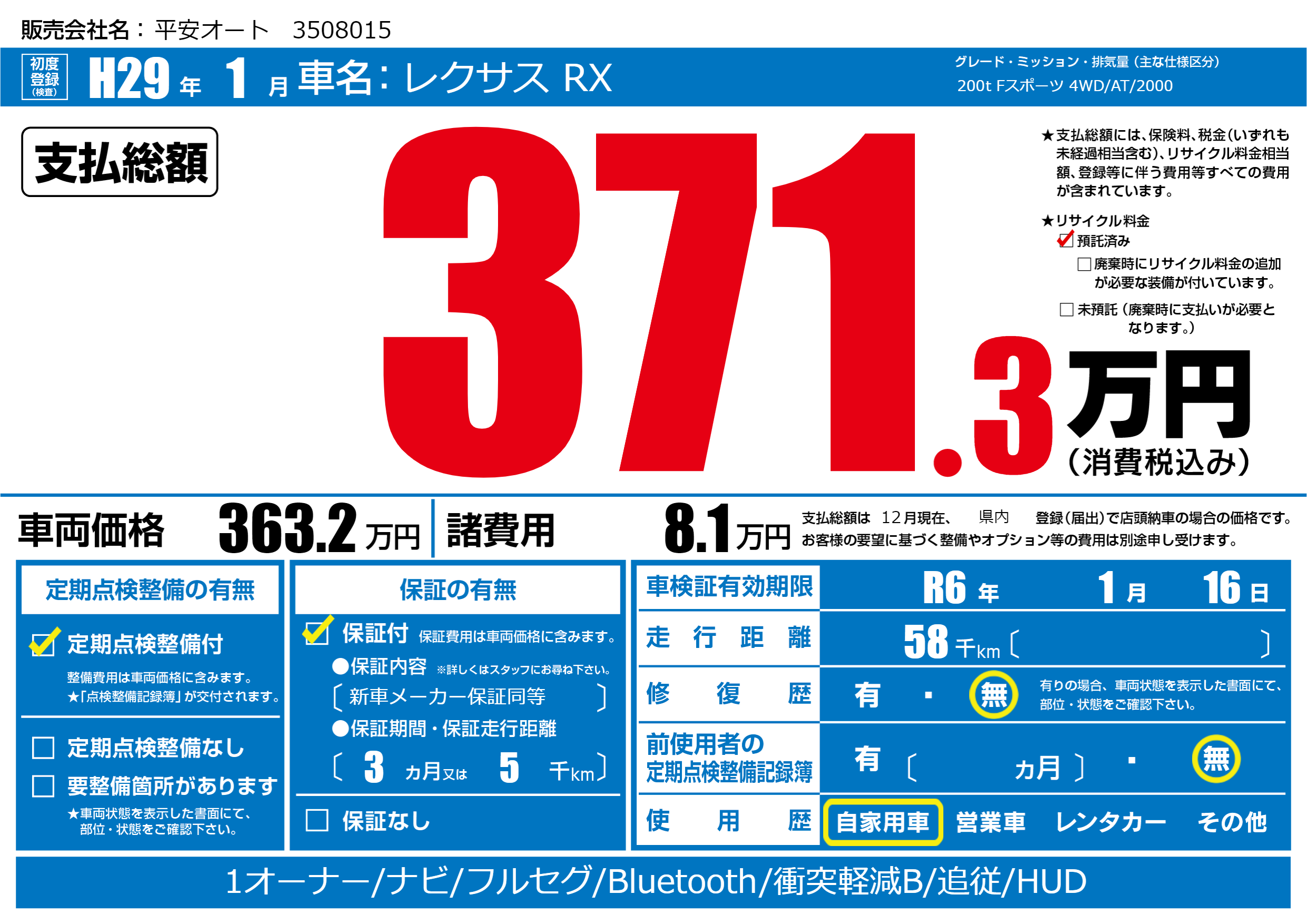 | 車名 | レクサス RX | グレード ミッション 排気量 |